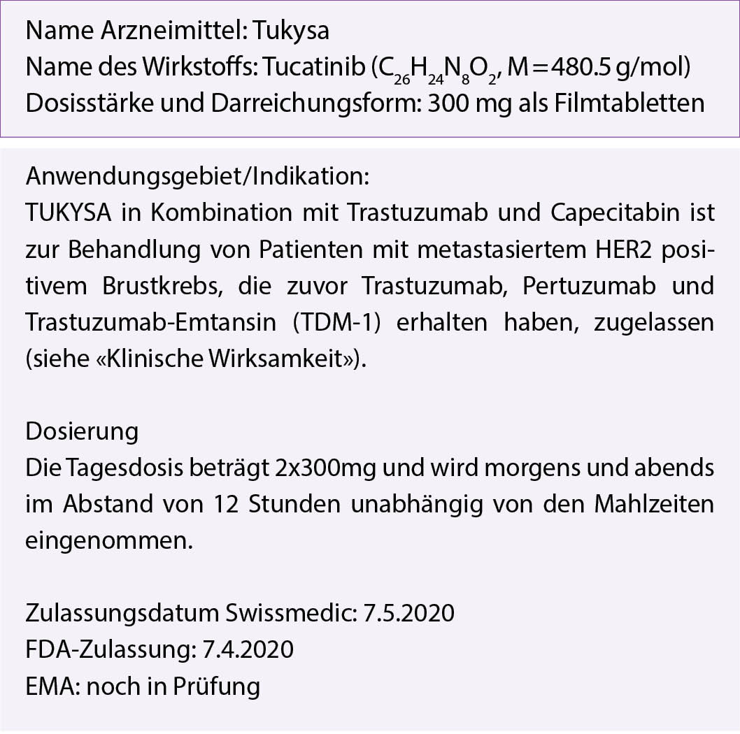 Als Zulassungsstudie wurde die doppelblinde, placebo-kontrollierte, 2:1 randomisierte Phase 2-Studie HER2CLIMB (NCT02614794) eingereicht. Tucatinib oder Placebo wurden als Kombination mit Trastuzumab und Capecitabine eingesetzt.