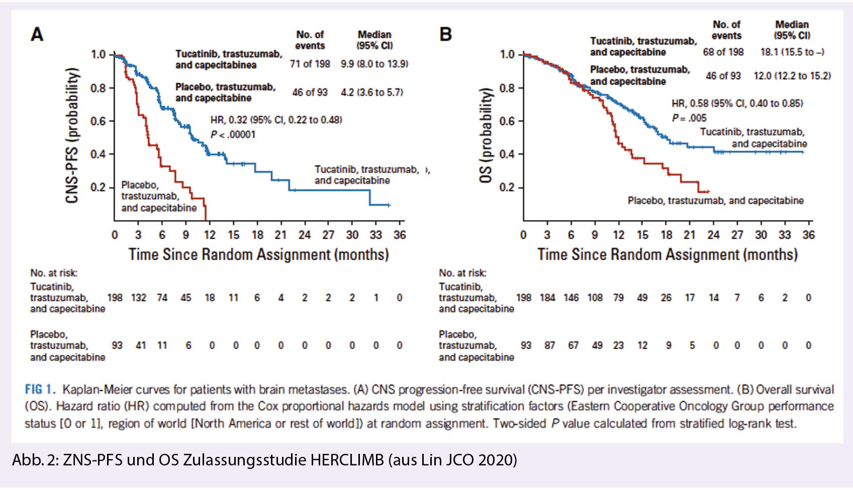 Die Analyse aller eingeschlossenen Patietinnen (N 612) ergab eine mediane PFS mit Tucatinib von 7.8 Monaten (95% confidence interval [CI] 7.5, 9.6) verglichen zu 5.6 Monaten (95% CI 4.2, 7.1) für ­Patientinnen im Placeboarm (hazard ratio [HR] 0.54; 95% CI 0.42, 0.71; p < 0.00001). Auch das mediane Gesamtüberleben (OS) für alle eingeschlossenen Patientinnen war in der Tucatinib-Gruppe signifikant verlängert mit 20,7 Monaten (11,6 Monate in der Kontrollgruppe), die Ein-Jahres-OS-Rate betrug 71,7% (Placebo: 41,1%; HR 0,49; 95% KI 0,30–0,80). Bei Patienten mit stabilen Hirnmetastasen bei Studienbeginn gab es dagegen keinen signifikanten Unterschied im OS.