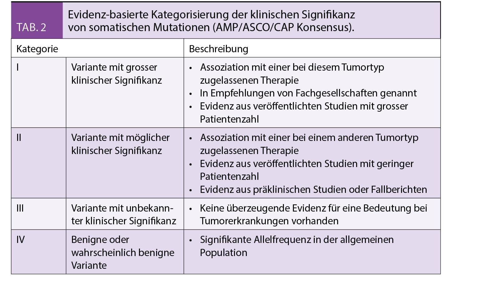Die Pathogenität einer somatischen Mutation kann analog zu Keimbahnveränderungen klassifiziert werden (6). Bedeutsamer ist die Beurteilung der Actionability einer Mutation. Eine Mutation wird als actionable bezeichnet, falls sie ein Ansprechen oder eine Resistenz auf eine zugelassene oder experimentelle Therapie voraussagt bzw. als diagnostischer und/oder prognostischer Marker verwendet werden kann (Tab. 1) (7). Informationen zur Actionability einer Mutation finden sich in öffentlich zugänglichen Online Datenbanken (MyCancerGenome.org, PersonalizedCancerTherapy.org, Oncokb.org) (8). Kürzlich wurde im Rahmen eines AMP/ASCO/CAP Konsensus eine Evidenz-basierte Kategorisierung von somatischen Varianten/Mutationen in Hinblick auf ihre diagnostische, prognostische und/oder therapeutische Bedeutung vorgeschlagen (Tab. 2) (9).