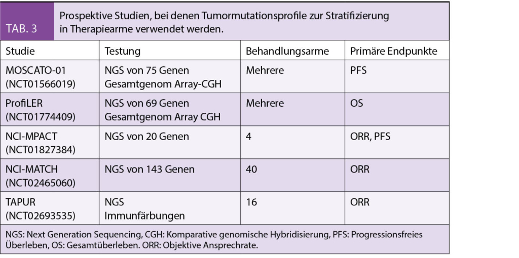 Bei onkologischen Therapiestudien mit «Baske» oder «Umbrella» Design erfolgt die Stratifizierung in die verschiedenen experimentellen Behandlungsarme anhand genotypischer Tumormerkmale (12). Das Mutationsscreening mittels zielgerichteter NGS ist ein effizientes Verfahren, Patienten für einen Studieneinschluss zu identifizieren. Die Machbarkeit und der klinische Nutzen einer systematischen Anwendung wird gegenwärtig in mehreren prospektiven Studien (MOSCATO-01, NCI-MPACT, NCI-MATCH, ProfiLER, TAPUR, etc.) unter Verwendung von klinisch relevanten Endpunkten wie Ansprechrate und Überlebenszeit untersucht (Tab. 3).