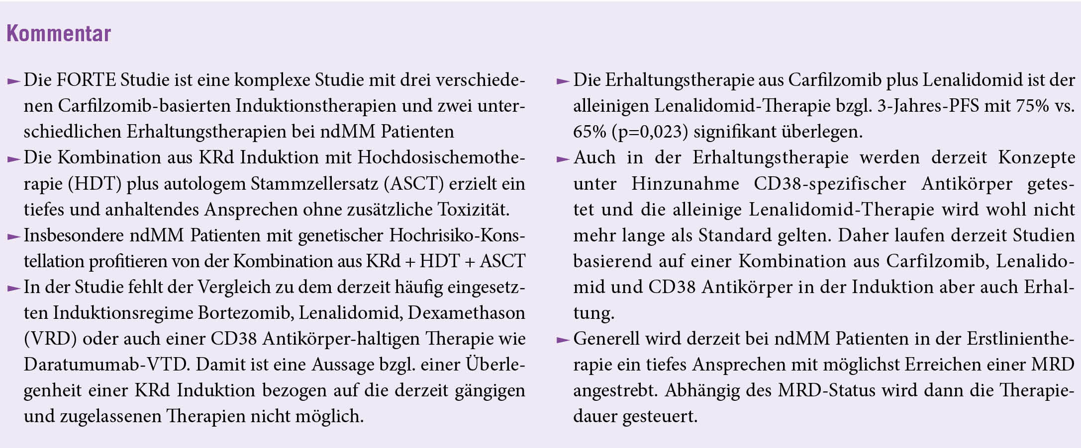 UNITO-MM-01/FORTE ist eine randomisierte, offene Phase-II-Studie, die in 42 italienischen Zentren durchgeführt wurde. ndMM Patienten < 65 Jahre mit einem Karnofskystatus > 60% nahmen teil. Die Patienten wurden nach dem Zufallsprinzip (1:1:1) einer KRd plus ASCT (vier 28-tägige Induktionszyklen mit Carfilzomib plus Lenalidomid plus Dexamethason [KRd], Melphalan 200 mg/m² und autologer Stammzelltransplantation [MEL200-ASCT], gefolgt von vier 28-tägigen KRd Konsolidierungszyklen), KRd12 (12 28-tägige KRd-Zyklen) oder KCd plus ASCT (vier 28-tägige Induktionszyklen mit Carfilzomib plus Cyclophosphamid plus Dexamethason [KCd], MEL200-ASCT und vier 28-tägige KCd-Konsolidierungszyklen) zugeteilt. Carfilzomib 36 mg/m² wurde intravenös an den Tagen 1, 2, 8, 9, 15 und 16 verabreicht; Lenalidomid 25 mg oral an den Tagen 1-21; Cyclophosphamid oral an den Tagen 1-21; Cyclophosphamid 300 mg / m² oral an den Tagen 1, 8 und 15; und Dexamethason 20 mg, oral oder intravenös an den Tagen 1, 2, 8, 9, 15, 16, 22 und 23. Danach wurden die Patienten nach der Induktions-/Konsolidierungstherapie stratifiziert und entsprechend dem Zufallsprinzip (1:1) einer Erhaltungstherapie mit Carfilzomib plus Lenalidomid oder Lenalidomid allein zugeteilt. Carfilzomib 36 mg/m² wurde intravenös an den Tagen 1-2 und 15-16 alle 28 Tage verabreicht. Carfilzomib wurde intravenös an den Tagen 1-2 und 15-16 alle 28 Tage für bis zu 2 Jahre verabreicht; Lenalidomid 10 mg wurde oral an den Tagen 1-21 alle 28 Tage bis zur Progression oder Unverträglichkeit in beiden Gruppen verabreicht. Die primären Endpunkte waren der Anteil der Patienten mit mindestens einem sehr guten partiellen Ansprechen (VGPR) nach der Induktion mit KRd versus KCd und das progressionsfreie Überleben (PFS) mit Carfilzomib plus Lenalidomid im Vergleich zu Lenalidomid allein als Erhaltungstherapie.