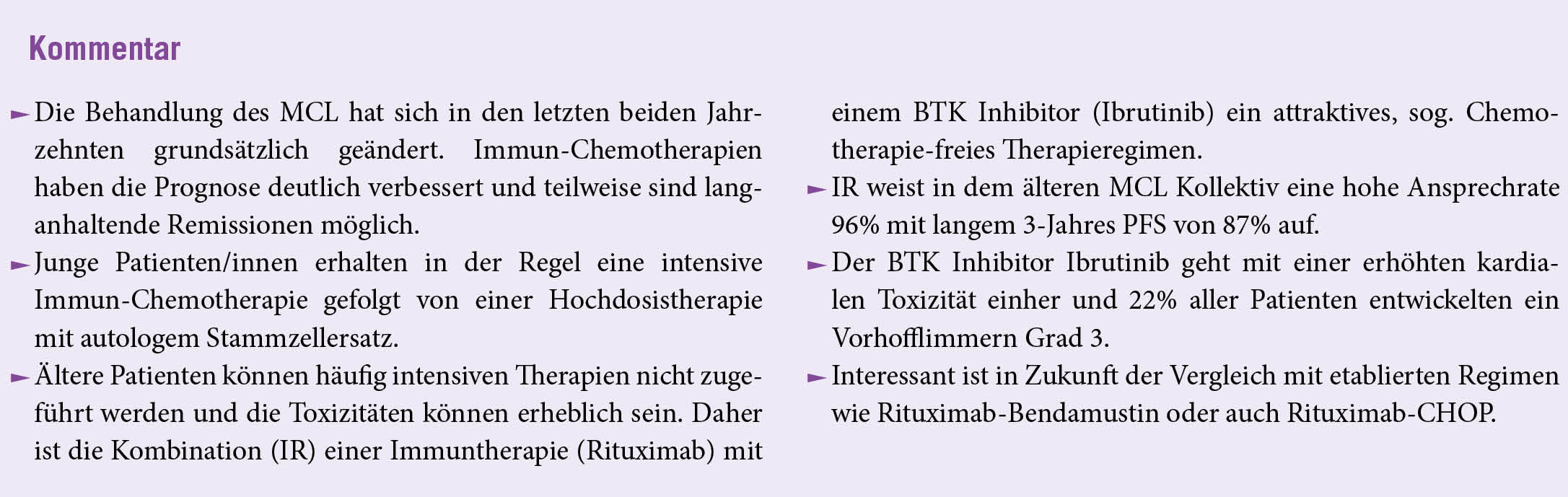Die IR-Kombination ist bei älteren Patienten mit MCL wirksam, wobei endgültige Schlussfolgerungen erst nach Durchführung einer randomisierten Studie möglich sind. Eine Basisuntersuchung auf kardiovaskuläre Risiken wird bei Einsatz von IR dringend empfohlen.