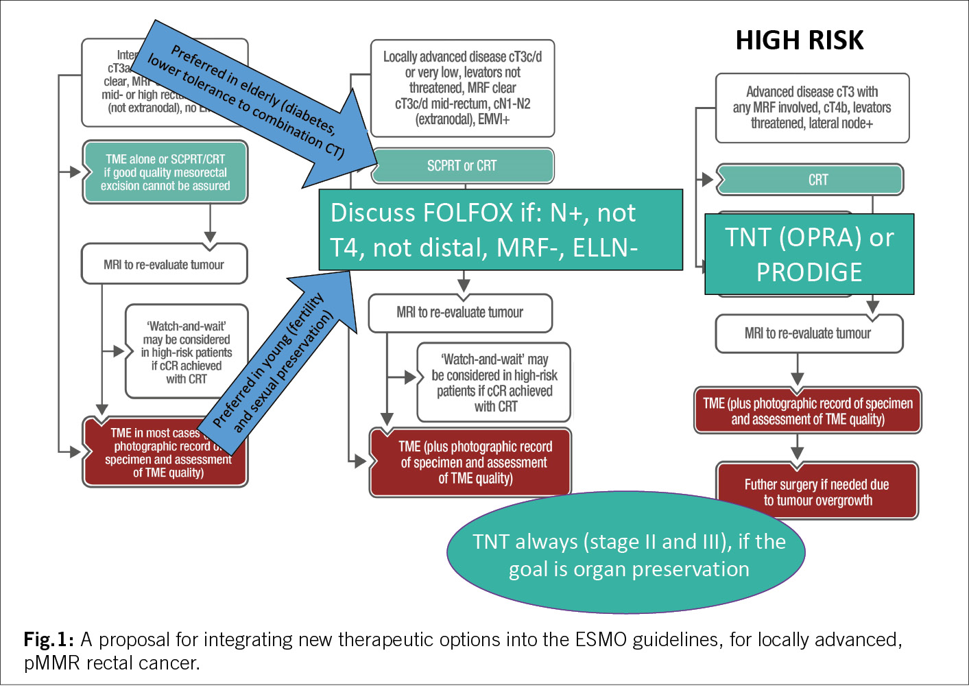 ◆ The ‘one size fits all’ approach is no longer applicable in rectal cancer, and decisions must be shared with the patient, establishing treatment goals based on their individual priorities. We need to personalize our strategy for each patient based on their values for toxicity, outcomes, neuropathy, fertility, and for overall functioning. Figure 1 presents a proposal for integrating new therapeutic options into the ESMO guidelines, for locally advanced, pMMR rectal cancer.