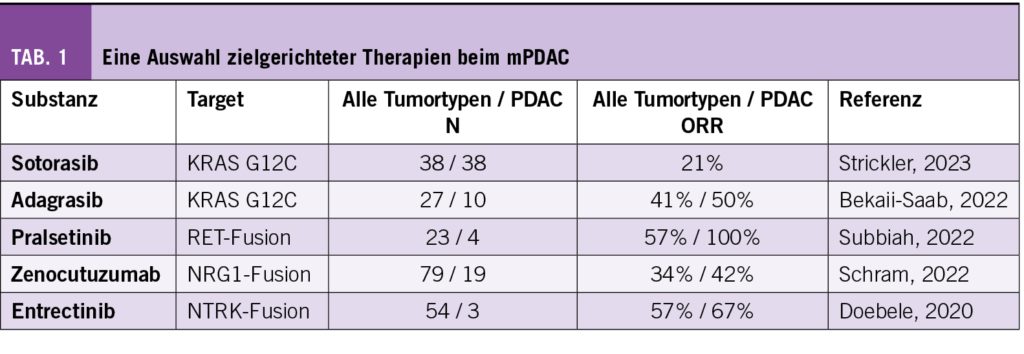 In einer Phase I/II Basket-Studie führte der Einsatz von Pralsetinib bei Patienten mit mPDAC und einer RET-Fusion (ca. 1%) zu einem Ansprechen bei allen 4 Patienten (ORR 100%) inkl. einer kompletten Remission (9). Ebenfalls selten (<1%) ist das Vorliegen einer NRG1-Fusion bei KRASwt mPDAC. Der Einsatz des bispezifischen Antikörpers Zenocutuzumab führte in einer Phase II Basket-Studie zu einer ORR von 42% (8/19 Patienten) bei Patienten mit mPDAC. Doebele et al. rapportierten für Patienten mit mPDAC und einer NTRK-Fusion (<1%) mit dem Einsatz von Entrectinib eine ORR von 67% (10). Die Phase II Destiny-PanTumor02 Studie testet zur Zeit den Einsatz von Trastuzumab deruxtecan bei HER2 exprimierenden soliden Tumoren, unter anderem auch bei Patienten mit mPDAC. Eine weitere Phase II Studie prüft aktuell eine Kombinationstherapie mit Binimetinib (MEK-Inhibitor) und Encorafenib (BRAF-Inhibitor) u.a. auch bei Patienten mit vorbehandelten BRAF V600E mutierten mPDAC.