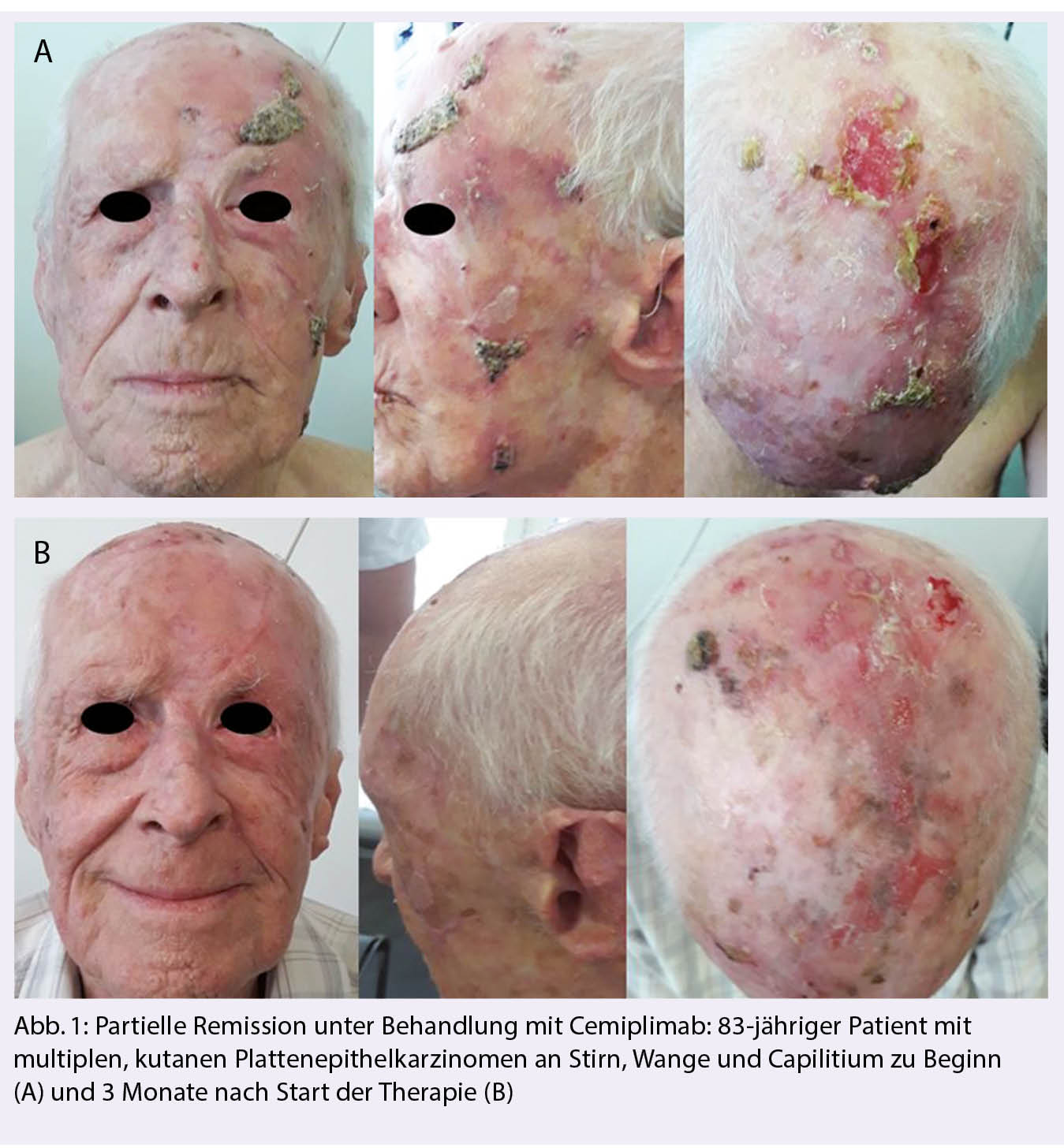 Auf Grund der kausalen Beteiligung der kumulativen UV-Exposition an der Entstehung der PEKs weisen diese, wie bereits eingangs erwähnt, die höchste Mutationsrate unter den verschiedenen Tumorentitäten auf. Unter der Annahme, das für Tumoren mit hohen Mutationsraten, die Wahrscheinlichkeit für die Bildung von Neoantigenen steigt die in der Folge vom Körpereigenen Immunsystem als «fremd» erkannt werden können, sollten die PEKs für die Behandlung mit ICI geradezu prädestiniert sein. Erste klinische Hinweise für die Wirksamkeit von ICIs beim fortgeschrittenen PEK lieferten Fallbeschreibungen zum Einsatz der anti-PD1 Antikörper Pembrolizumab, Nivolumab oder Cemiplimab mit zum Teil langanhaltenden, kompletten Remissionen (> 24 Monate) (10-12). In Abbildung 1 ist der erfreuliche Verlauf eines 83-järigen Patienten mit multiplen PEK unter einer Behandlung mit Cemiplimab dargestellt. Basierend auf diesen vielversprechenden Fallbeschreibungen wurde eine erste prospektive, multizentrische Phase 1/2 Studie mit Cemiplimab lanciert (13): 26 Patienten (10 lokal fortgeschrittenes PEK + 16 metastasiert) aus der erweiterten Phase 1, sowie 59 Patienten mit metastasiertem (lymphogen + peripher) PEK erhielten 2-wöchentlich Cemiplimab in einer Dosierung von 3 mg/Kg Körpergewicht intravenös. Die Behandlung wurde in der Phase 1 bis maximal 48 Wochen in Phase 2 bis insgesamt 96 Wochen fortgeführt. Für 13 der 26 Patienten (50%) aus der Phase 1 und 28 der 59 Patienten (47%) aus der Phase 2 konnte unter der Behandlung ein objektives Ansprechen mit kompletten Remissionen für vier metastatische Patienten erzielt werden. Ein weiterer Zugewinn für einen Teil der Patienten war neben den hohen Ansprechraten auch die Dauer des Ansprechens von mindestens 6 Monaten in mehr als der Hälfte (57%) der «Responder». Als häufigste Nebenwirkungen traten die für eine ICI-Behandlung typischen Symptome wie Durchfall (27%, Müdigkeit (24%), Übelkeit (17%) und Hautauschlag (15%) auf. In den 12-Monats Verlaufsdaten der Kohorte für metastasierte PEK bestätigte sich die hohe Ansprechrate von rund 50% mit einer Dauer des Ansprechens von mehr als 12 Monaten für 75% der «Responder», das mediane Progressionsfreie Überleben betrug 18.4 Monate. (14).