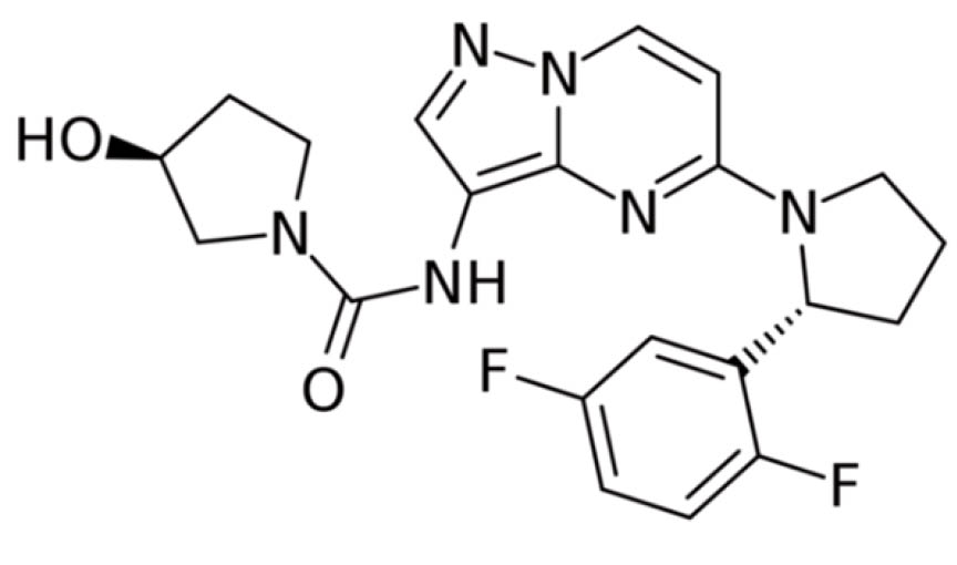Larotrectinib ist ein niedermolekularer hochselektiver Inhibitor der drei Tropomyosin-Rezeptor-Kinase-Proteine TRKA, TRKB und TRKC, die zur Schmerzregulierung, Propriozeption, Appetitsteuerung sowie Gedächtnisregulierung beitragen. Bei etwa einem Prozent aller soliden Krebsarten und in gut 1000 Fällen jährlich in Europa liegt ein Fusionsprotein vor, an dem eines der drei Gene der Tropomyosin-Rezeptor-Kinase-Proteine beteiligt ist. Die Gene heissen Neurotrophic receptor tyrosine kinase 1-3, abgekürzt NTRK 1-3. Die TRK-Fusion führt zur Überexpression dieser funktional pathogenen Proteine, was dann dauerhaft Liganden unabhängig den entsprechenden Signalweg aktiviert und ein unkontrolliertes Zellwachstum bewirkt. Daher wird auch von TRK-Fusionstumoren gesprochen.