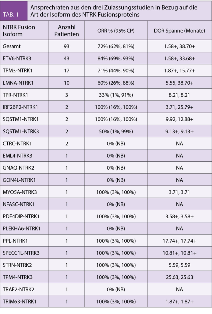 Primärer Endpunkt war die Gesamtansprechrate. In Tabelle 1 werden die Ansprechraten aus den drei Zulassungsstudien in Bezug auf die Art der Isoform des NTRK Fusionsproteins gezeigt.