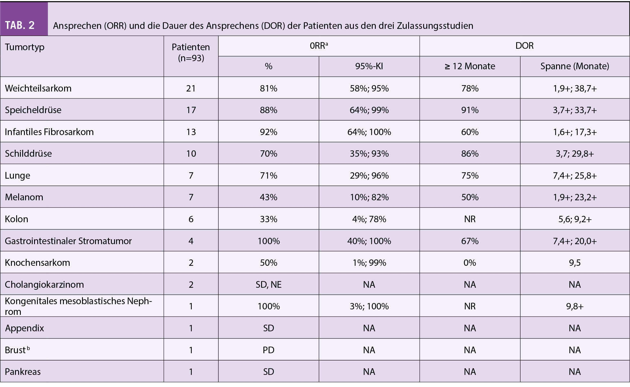 Da das NTRK-Fusionsprotein bei verschiedenen weiteren Tumoren auftreten kann, wurden 3 Tumortyp-unabhängige sog. Basket-Studies durchgeführt, in die alle Patienten aller Alterskategorien mit einem TRK-Fusionsprotein-positiven Tumor, lokal fortgeschritten oder metastasiert, nach primär erfolgloser Standardtherapie eingeschlossen wurden.