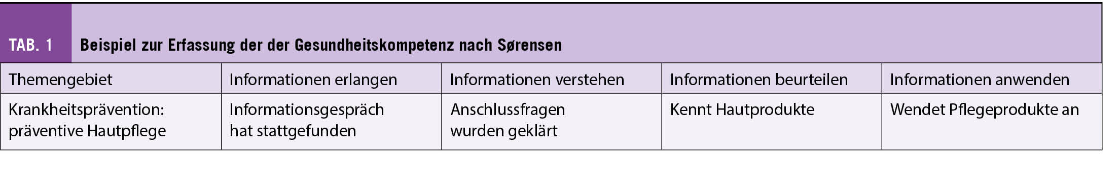 Sørensen et al. entwickelten 2012 ein Modell zur Erfassung der Gesundheitskompetenz. Sie beschrieben diese anhand von zwölf Dimensionen. Das Modell besteht aus den drei Bereichen Krankheitsprävention, Krankheitsbewältigung und Gesundheitsförderung. Die einzelnen Bereiche werden in vier Unterbereiche eingeteilt: Informationen erlangen, Informationen verstehen, Informationen beurteilen und Informationen anwenden (Tab. 1).