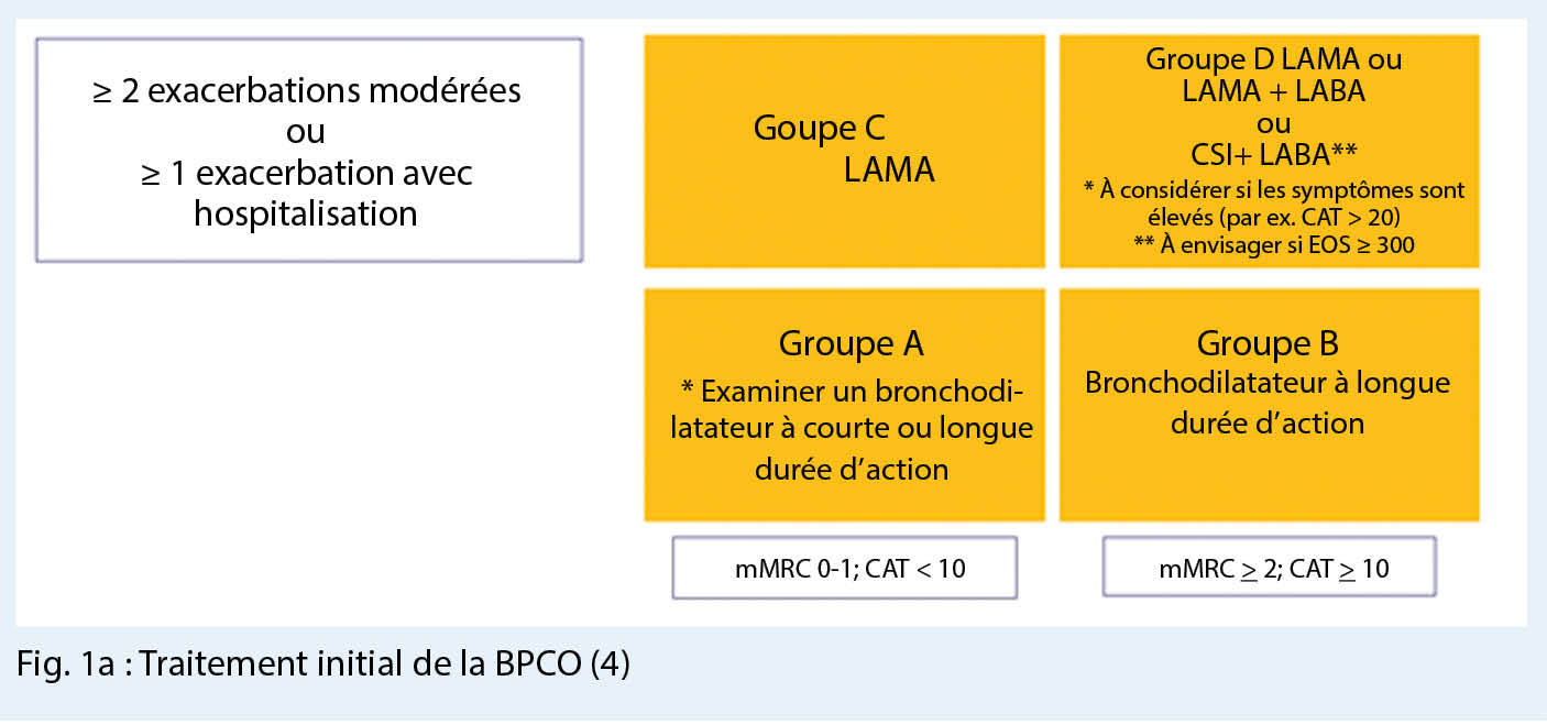 La classification en ces 4 groupes de thérapie détermine la thérapie recommandée, une distinction étant désormais faite entre les patients naifs de la thérapie (fig. 1a), c’ est-à-dire ceux qui doivent commencer une thérapie contre la BPCO et les patients prétraités (fig. 1b), et pour cette procédure thérapeutique des algorithmes ont été développés.