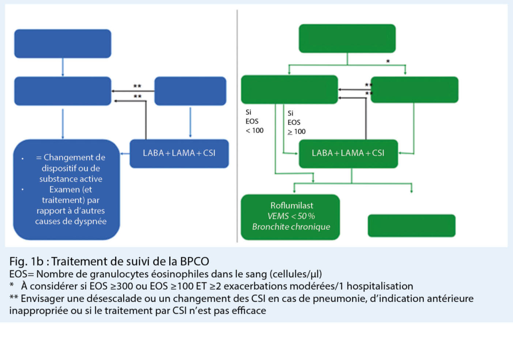Si la dyspnée est au premier plan, le traitement bronchodilatateur doit passer d’ une monothérapie (LABA ou LAMA) à une bithérapie (LABA / LAMA) ou de LABA / CSI à une trithérapie (LABA / LAMA / CSI), ou encore à une combinaison de bronchodilatateurs (LABA / LAMA).