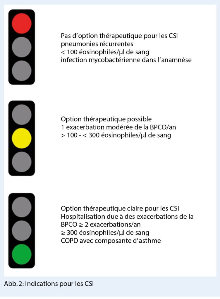 Des études ont montré que les patients présentant un taux d’ éosinophiles de 300/μl de sang ou plus bénéficient d’ un traitement supplémentaire de CSI pour réduire le taux d’ exacerbation. En revanche, cet effet est très faible chez les patients atteints de BPCO avec des valeurs inférieures à 100 éosinophiles/μl, de sorte que GOLD recommande maintenant que l’ escalade ou la désescalade du traitement de la BPCO soit également basée sur le nombre d’ éosinophiles (fig. 2).