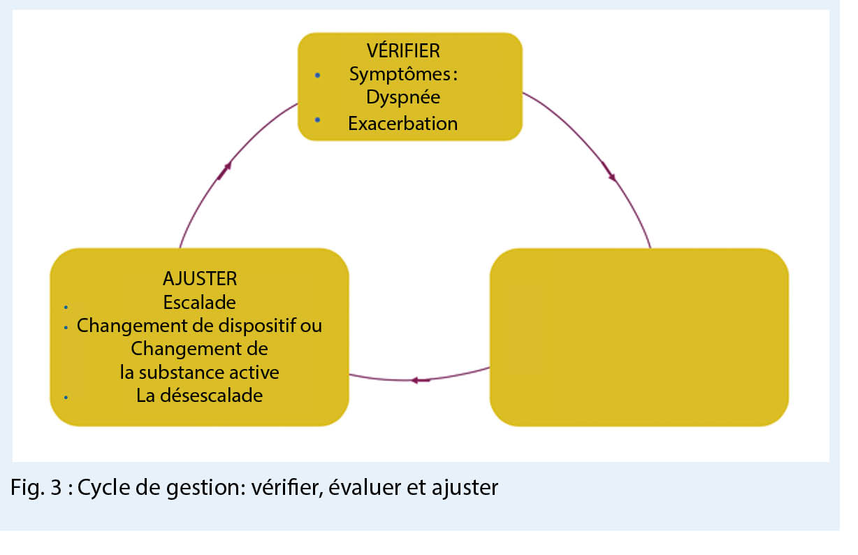 Dans la gestion de la BPCO, il est essentiel de contrôler régulièrement le succès de la thérapie, comme dans le cas de l’ asthme, et d’ ajuster le traitement si nécessaire, par exemple si le patient continue d’ être symptomatique, s’il fait des exacerbations fréquentes, si la technique d’ inhalation à contrôler à chaque contact avec le patient ne s’ adapte pas de manière optimale et si le dispositif d’ inhalation doit être changé éventuellement ou s’ il existe de (nouvelles) maladies concomitantes aggravantes.