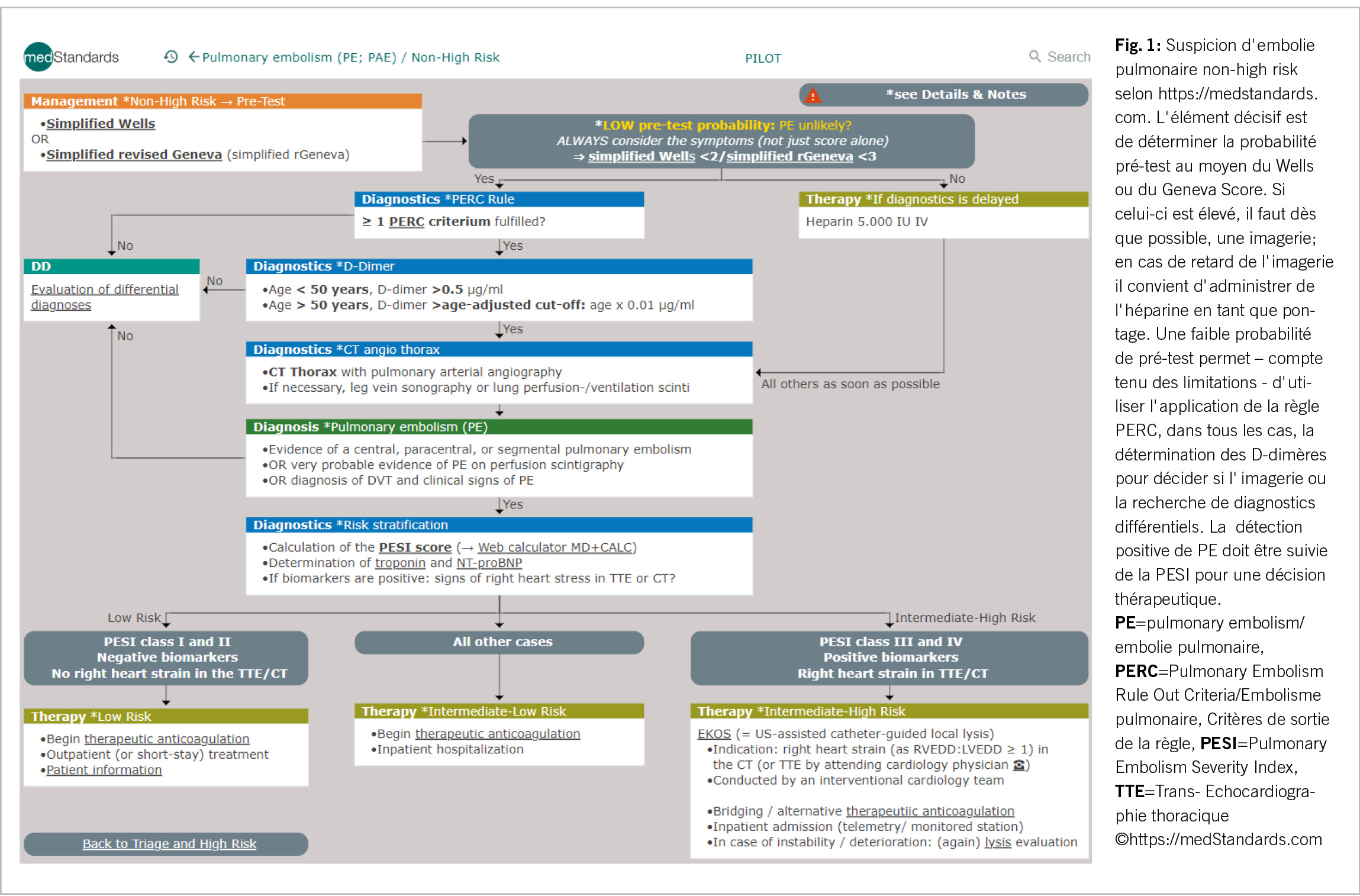 Si une embolie pulmonaire est détectée lors de l’ imagerie suivante, et si l’ hémodynamique est stable, l’ interprétation se fait en tenant compte de la clinique et des comorbidités. Pour cela, il faut la répartition des degrés de gravité ou la classification des risques en termes de risque de mortalité en Low Risk, Intermediate-Low Risk, Intermediate-High Risk (et High Risk = instabilité, risque de mortalité élevé). Cela se fait par le calcul du score PESI (simplifié) à l’ aide de facteurs cliniques et anamnestiques (l’ âge, le sexe, les paramètres vitaux, les antécédents).