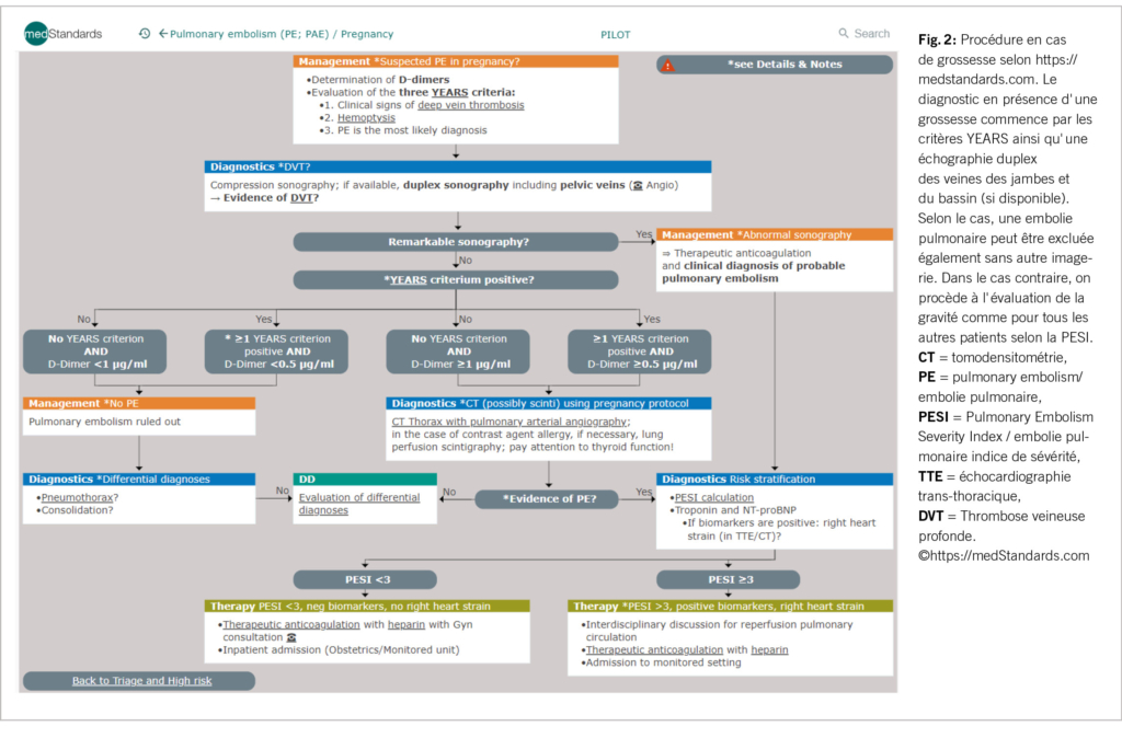 Comme outil de diagnostic simplifié, les critères de Years (2) peuvent éventuellement être pris en compte (comprend : clinique, hémoptysie, probabilité). Ceci surtout en cas de grossesse (fig. 2), ou pour gagner du temps dans d’ autres cas aussi pour obtenir une vue d’ ensemble. Ces critères nécessitent toutefois une évaluation en dehors d’  une grossesse (3).