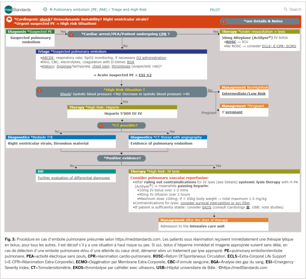 Rapidité et fermeté caractérisent la procédure chez les patients à haut risque (nécessité de réanimation, choc) et l’ absence d’ autres diagnostics différentiels plus probables (fig. 3). Cette constellation plaide en faveur d’  une obstruction importante de la voie artérielle pulmonaire par un thrombus embolisé. En situation de réanimation et de suspicion d’ embolie pulmonaire, il faut immédiatement lyser sans autre diagnostic (50mg d’ altéplase i.v. en bolus sans interrompre la réanimation) afin d’ améliorer le résultat (rétablissement plus rapide d’ une circulation spontanée – ROSC), suivi d’ un bolus de 5.000 U d’ héparine i.v. (1).