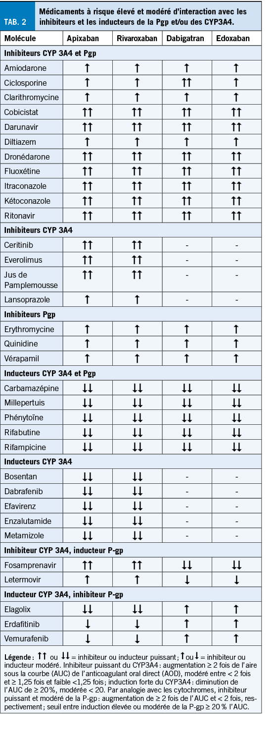 Les interactions pharmacocinétiques impliquent les médicaments modulateurs des cytochromes 3A4 (CYP3A4) et de la PgP. Ceux-ci sont catégorisés par la FDA en inhibiteurs/inducteurs forts, modérés ou faibles selon l’ augmentation ou la diminution de l’ exposition (aire sous la courbe AUC) en présence de l’ inhibiteur ou de l’ inducteur, respectivement (27). En raison de la sévérité des effets indésirables de ces médicaments, des marges plus faibles sont proposées en pratique pour les ACOD. La Table 2 présente quelques médicaments couramment utilisés ayant un risque d’ interaction pharmacocinétique modéré à majeur. D’ une façon générale, le risque d’ interaction est considéré comme majeur par la société européenne de rythmologie (28) et certains autres experts (29) lorsque l’ interaction médicamenteuse cause un doublement de l’ AUC d’ un ACOD dans le cas d’ un inhibiteur, et une diminution de plus de 20 % de l’ AUC dans le cas d’ un inducteur. De principe, il faudrait à chaque fois vérifier s’ il existe des données chez l’ humain (littérature, monographie du médicament) démontrant que de tels seuils sont atteints en présence d’ un inhibiteur/inducteur. Ceci concerne principalement les inhibiteurs/inducteurs puissants de la Pgp et les inducteurs/inhibiteurs modérés à la fois des CYP3A4 et de la PgP. Un inhibiteur puissant du CYP3A4 seul est considéré à risque majeur uniquement pour l’ apixaban et le rivaroxaban, plus largement éliminé par voie hépatique via les CYP.