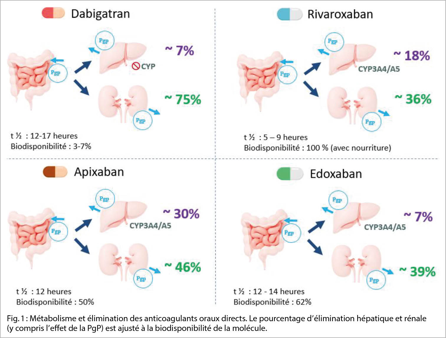 D’ un point de vue pharmacologique, les ACODs se distinguent entre eux par leur métabolisme et leur élimination (Table 1) ; ils sont tous substrats de la P-glycoprotéine (PgP) qui impacte leur biodisponibilité (18, 19). Le principal facteur de risque de surdosage est l’ insuffisance rénale (11, 15, 20, 21). L’ âge avancé ou un poids extrême (<50 kg ou > 120 kg) sont des facteurs de risque dans une moindre mesure (3, 22-24). Une étude de simulation évaluant la contribution de différents facteurs sur les concentrations de médicament indique que chaque facteur pris séparément augmente modérément l’ exposition aux ACOD, et c’ est surtout le cumul de ces facteurs de risque qui peut considérablement augmenter l’ exposition à ces médicaments (23).