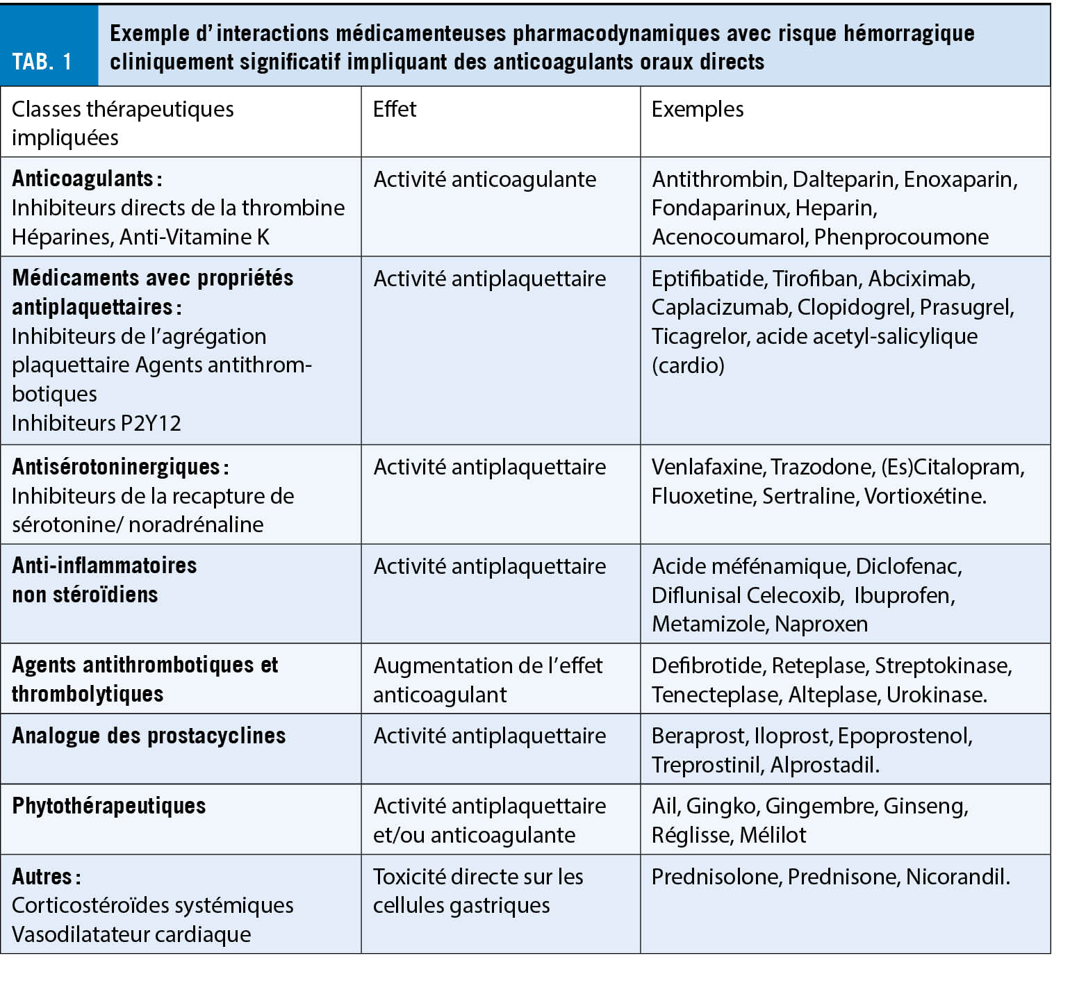 D’ un point de vue de l’ effet, toute co-médication influençant l’hémostase augmente le risque hémorragique ou thrombotique. Les classes médicamenteuses classiquement impliquées dans ce type d’ interactions dont le risque est considéré comme augmenté sont résumées dans le Tableau 1. De nombreuses situations cliniques justifient la prise simultanée de deux ou plusieurs traitements actifs sur l’ hémostase, pour autant que la balance bénéfice/risque soit favorable. Dans de tels cas, une surveillance rapprochée pour la détection précoce des effets indésirables est recommandée.
