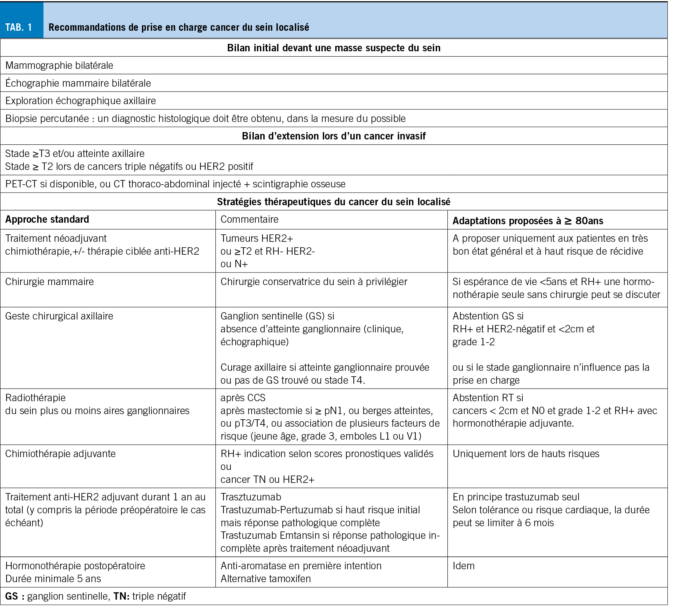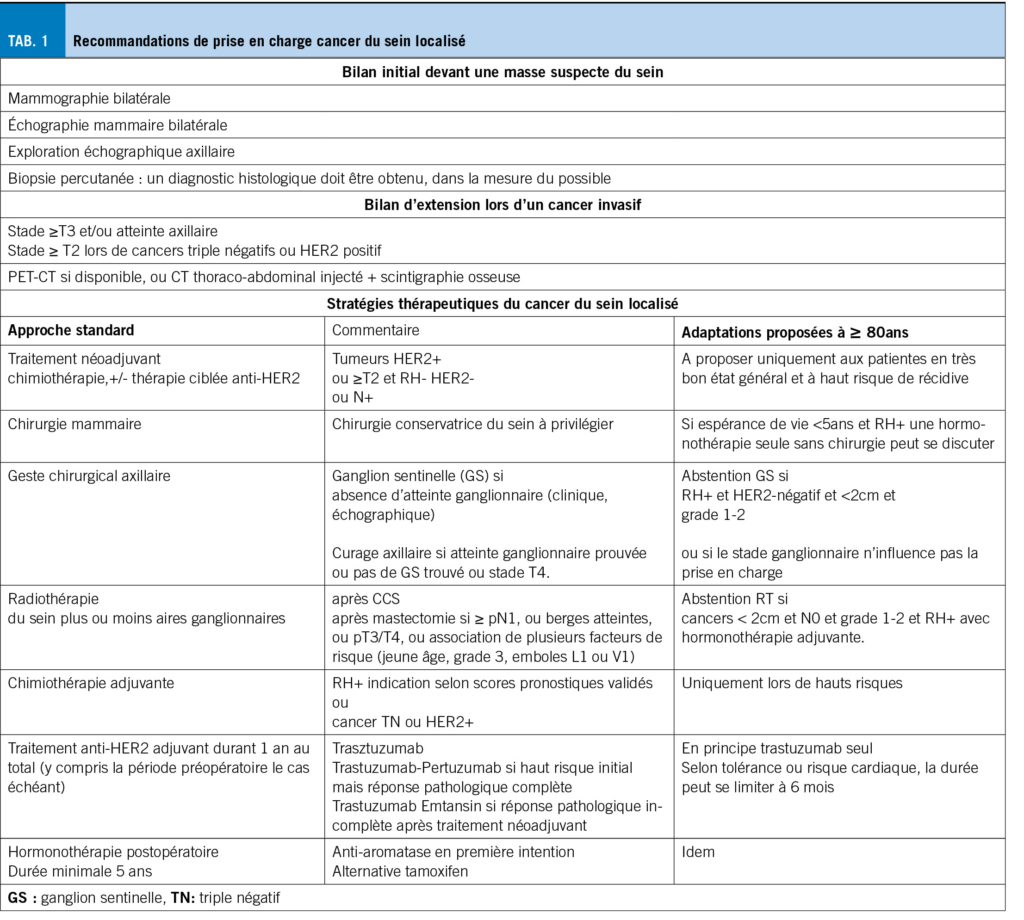 Lorsque l’espérance de vie est <10 ans, le dépistage mammographique est futile car une réduction de la mortalité par cancer du sein est peu probable (7). La prise en charge standard est résumée dans le tableau 1. Le choix thérapeutique dépend essentiellement du stade TNM et du phénotype histologique tableau 2. Environ 90 % des patientes âgées de ≥ 80 ans présentent des tumeurs RH+ HER2- (8).