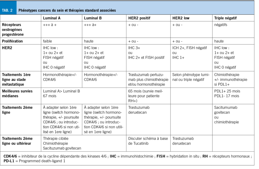 Le traitement de toute patiente atteinte d’un cancer du sein métastatique, quel que soit son âge, est non curatif et vise à contrôler le cancer et à maintenir la qualité de vie. Nous nous limiterons aux premières lignes de traitements (tableau 2).