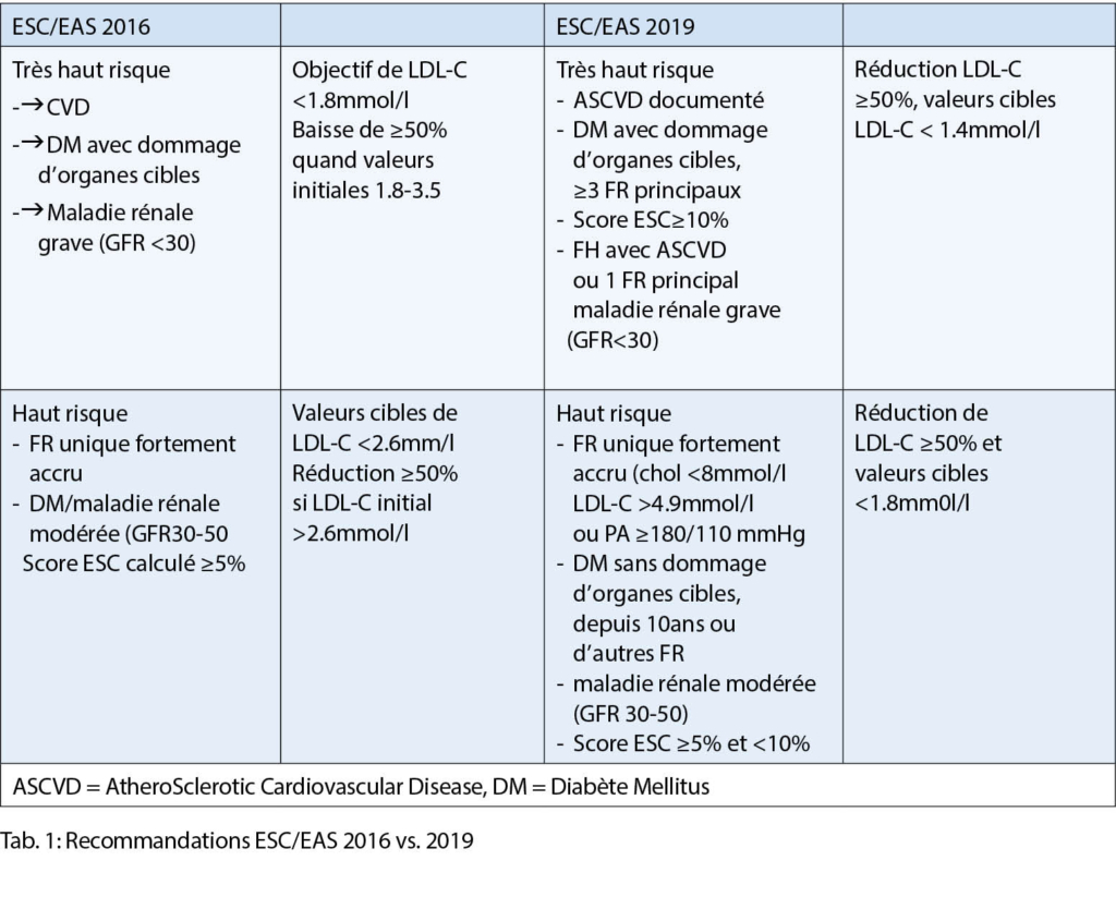 Une comparaison des recommandations de l’ESC/EAS 2016 vs. 2019 est montrée dans la tabelle 1.