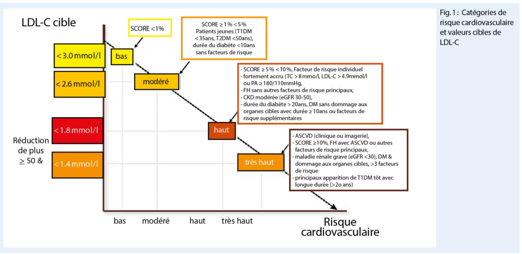 Il présentait ensuite les nouvelles catégories de risque et les valeurs cibles correspondantes. L’ essentiel de ces catégories et du risque cardiovasculaire correspondant et montré dans la figure 1 (3).