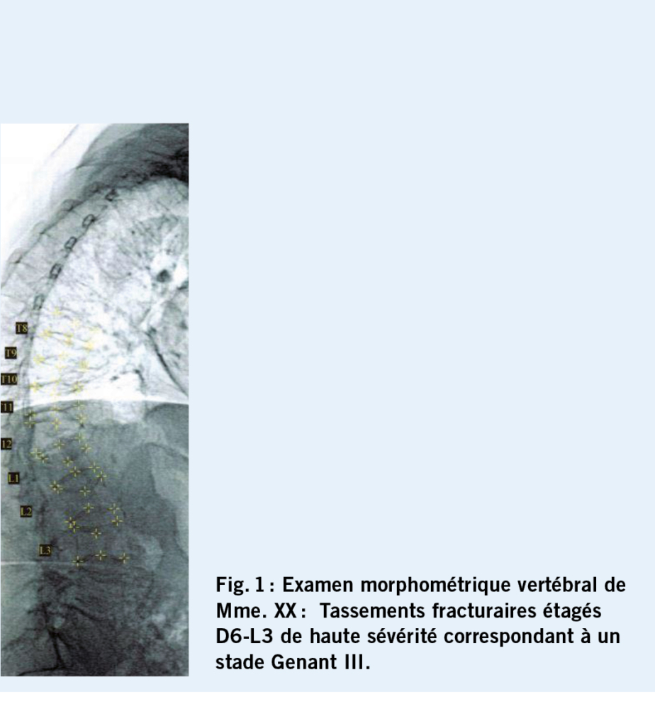 Une nouvelle fracture vertébrale exigera un contrôle IRM. L’ urgence de la situation justifiera le recours à un traitement antirésorbeur puissant et rapidement efficace tel que le denosumab, 60 mg par voie s.c. dont l’ effet antirésorbeur est pratiquement immédiat dès les premiers jours (13). Dans un deuxième temps, l’ indication à un anabolisant osseux tel que le tériparatide ou un de ses biosimilaires fera l’ objet d’ une concertation avec le spécialiste des maladies osseuses (14,15).