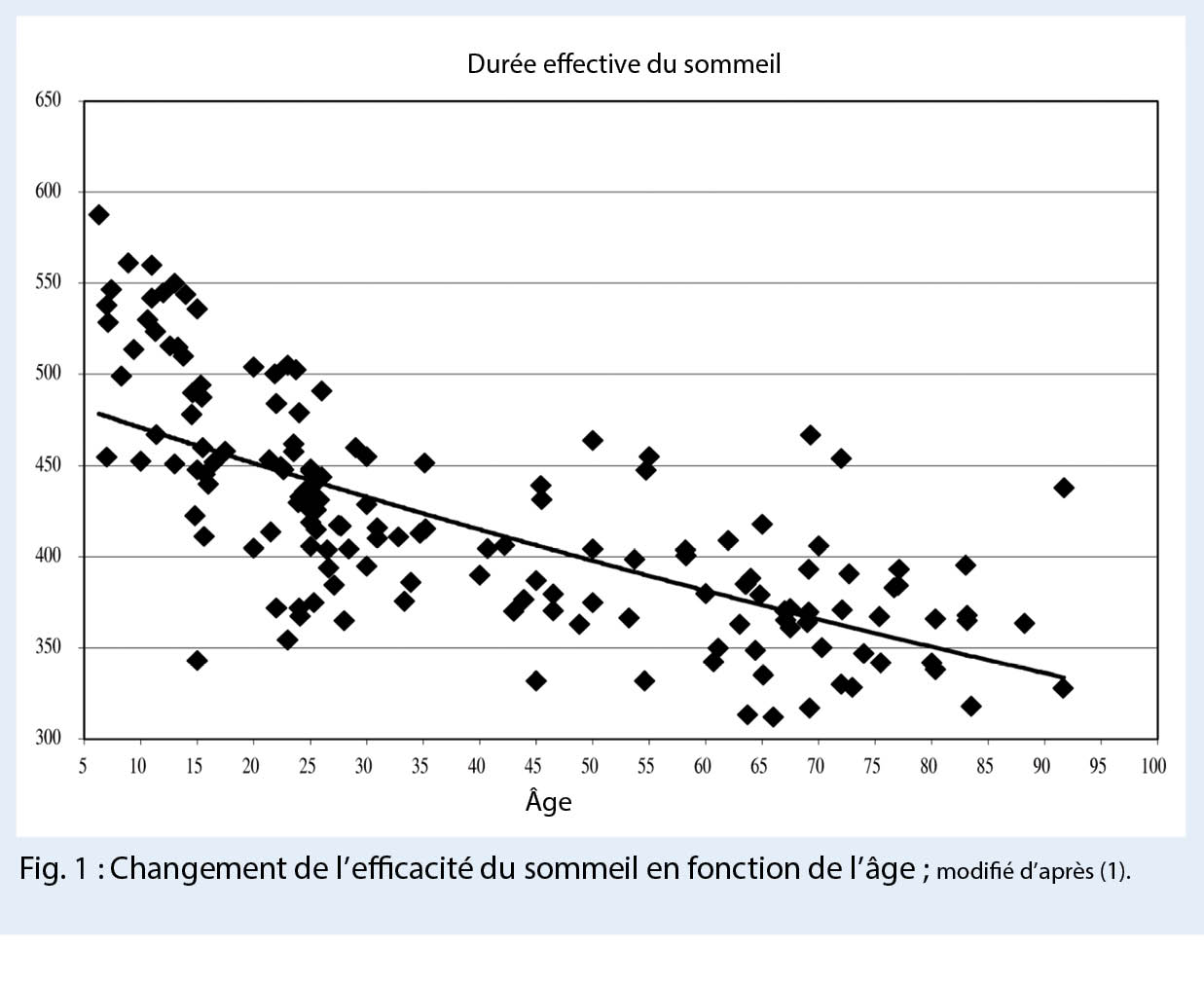 La mauvaise nouvelle dès le début : le sommeil ne s’ améliore généralement pas avec l’ âge. Il y a une diminution de la durée du sommeil et une augmentation de la durée de l’ éveil (1) (fig. 1). Mais malheureusement le sommeil devient également moins stable. Tandis que les enfants dorment profondément, les personnes âgées n’ atteignent plus cette profondeur de sommeil (2). En outre, un changement dans le contrôle du rythme circadien se produit dans la mesure où le rythme veille-sommeil est plus susceptible d’ être perturbé. Avec l’ âge, un décalage en avant du rythme de 24 heures survient (3). Cela débouche souvent sur des heures de coucher précoces. Si une personne âgée se couche donc dès 21 heures, il est généralement irréaliste de penser qu’ elle sera capable de bien dormir jusqu’ à 7 heures le lendemain matin. Et si des somnifères sont ensuite prescrits en raison de plaintes d’ insomnie, cela pose souvent des problèmes. Cela entraîne une dépendance et augmente les troubles cognitifs.