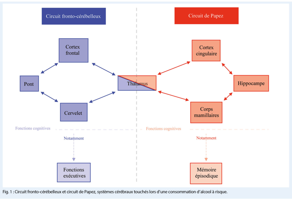 Le circuit de Papez, quant à lui, comprend le cortex cingulaire, le thalamus, l’ hippocampe et les corps mamillaires et est impliqué notamment dans la mémoire épisodique (7). Les tableaux cognitifs des patients avec consommation excessive d’ alcool sont marqués par des atteintes des fonctions exécutives et mnésiques, mais également visuo-constructives et dans le domaine de la cognition sociale (fig. 1).