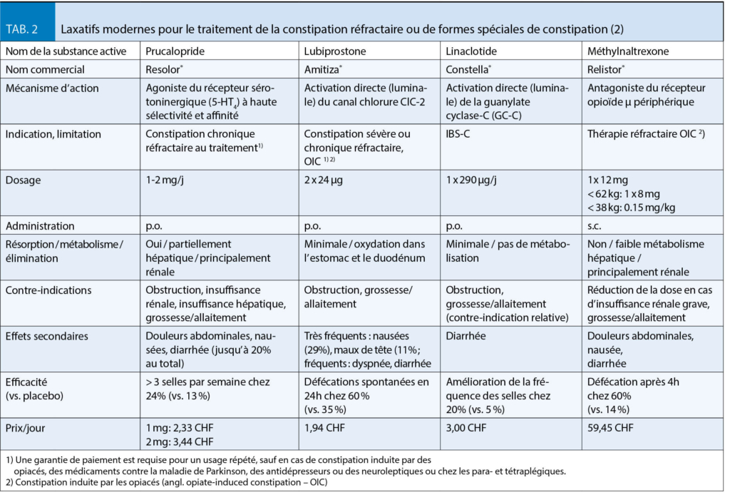 S’ il n’ y a pas de réponse après un traitement avec au moins deux laxatifs de classes différentes sur une période d’ au moins 9 mois, un nouvel examen critique de l’ étiologie (obstruction mécanique ou carcinome ? Trouble de l’ évacuation anorectale avec indication de diagnostics fonctionnels ? Des causes secondaires ? Des médicaments/opiacés constipants ?), une thérapie avec les laxatifs les plus récents et environ 2 à 3 fois plus chers tels que le lubiprostone (Amitiza®) ou le prucalopride (Resolor®) est indiquée (tab. 2).