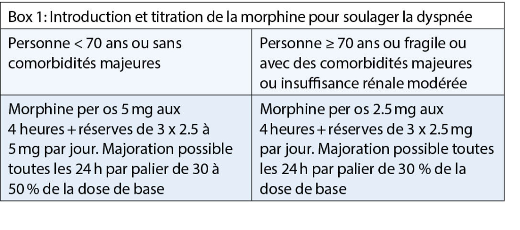 La dyspnée, définie comme une sensation subjective d’ un inconfort respiratoire, fait partie des symptômes les plus fréquemment exprimés par le patient. Elle est souvent accompagnée d’ angoisses et de peur de suffocation. Des prévalences jusqu’ à 75 % sont décrites chez des personnes en fin de vie (2). La prise en charge la plus efficace reste l’ optimisation du traitement de la maladie responsable de la sensation de dyspnée. A ce titre, les traitements de l’ insuffisance cardiaque et de la bronchopneumonie chronique obstructive (BPCO) sont maintenus le plus longtemps possible, même en approchant la fin de vie. En terme de traitement à visée symptomatique, la molécule qui s’ est avérée la plus efficace est la morphine (3). Son mode d’ action n’ est pas encore entièrement élucidé, mais des récepteurs µ ont été trouvés dans l’ arbre bronchique. Il s’ agit donc probablement d’ un effet lié à cette classe de médicaments, ce qui ouvre la possibilité d’ utiliser aussi les autres opiacés, malgré l’ absence d’ études bien menées. La crainte d’ une détresse respiratoire est infondée si la voie d’ administration est orale, le dosage adapté et la titration faite progressivement (Box 1) (4).