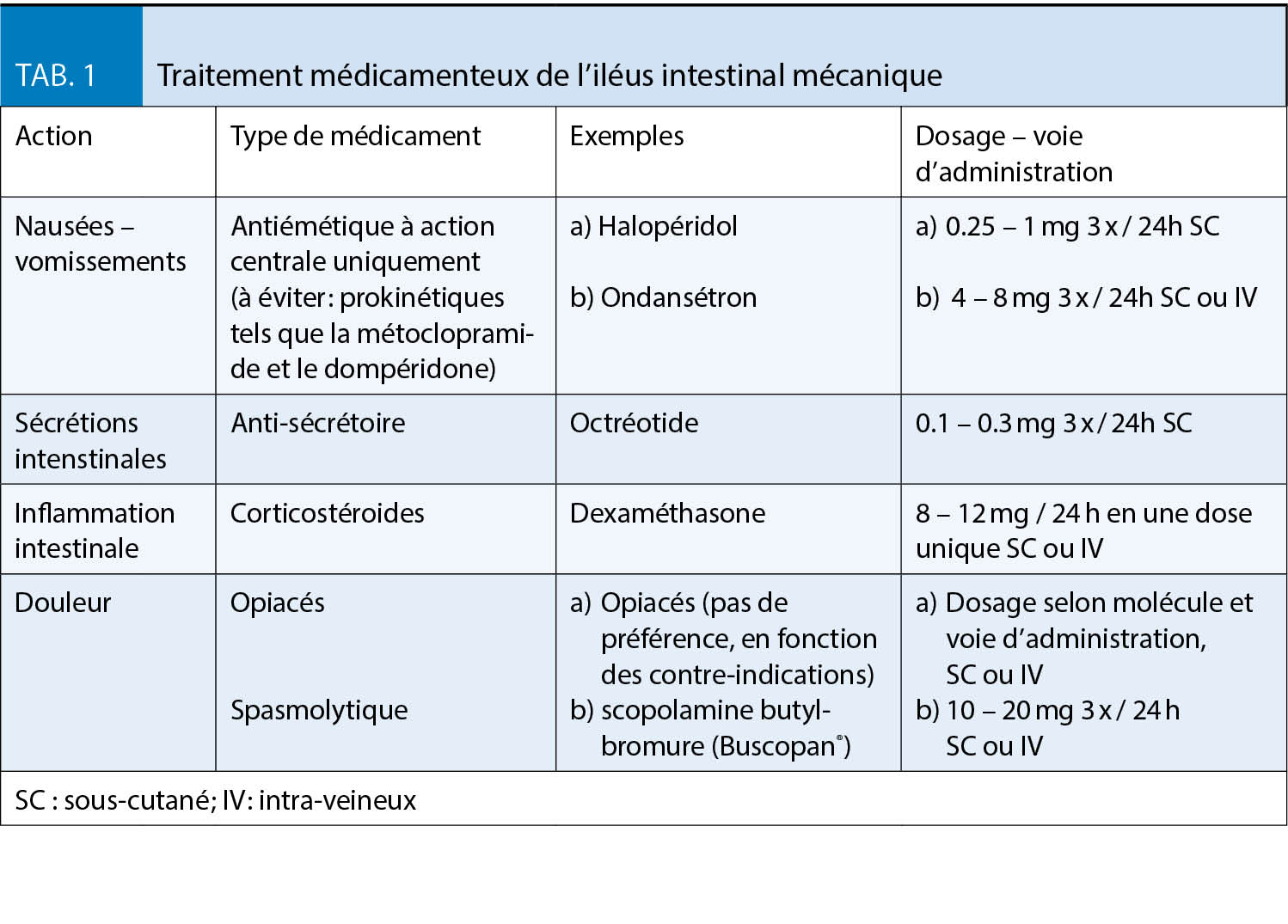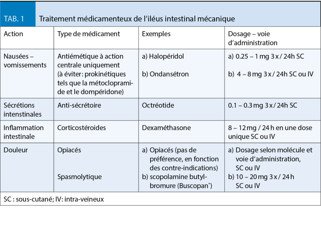 Les nausées et vomissements (n/v) en soins palliatifs sont relativement fréquents. En cas de cancer jusqu’ à 70 % des patients sont concernés (8). Cependant, les autres maladies terminales telles que l’ insuffisance cardiaque ou rénale et la BPCO provoquent également des n/v chez 50 % des malades (2). Certaines causes spécifiques, telles que la chimio- ou radiothérapie, le traitement par opiacés, une atteinte gastro-intestinale, des troubles métaboliques ou une atteinte intracérébrale (métastases, hypertension intra-crânienne) peuvent être identifiées et traitées; mais la plupart du temps aucune cause ou au contraire une origine multifactorielle est rencontrée chez ces patients (9). La métoclopramide est la molécule de première intention pour les n/v induites par les opiacés et les troubles métaboliques. La réponse est dose-dépendante et nécessite parfois une titration jusqu’ à 80mg/j (10). En cas de n/v induits par chimio- ou radiothérapie l’ ondansétron s’ est avéré très efficace (11). Les corticostéroides sont indiqués lors d’ hypertension intracrânienne, mais peuvent également être prescrits comme adjuvant à d’ autres antiémétiques (12). Finalement, l’ halopéridol est indiqué en cas de contrôle insuffisant par les autres antiémétiques, et lors d’ un iléus intestinal mécanique (13). L’ iléus se manifeste chez 3-15 % des patients avec un cancer, et principalement chez ceux atteints de cancers ovariens (20-50 %) et coliques (10-29 %)(14). Selon l’ endroit, l’ origine de l’ obstruction, les souhaits du patient et son état général, une intervention chirurgicale peut être envisagée, voire la pose d’ un stent ou d’ une gastrostomie de décharge. Pourtant, la plupart du temps, une prise en charge symptomatique est indiquée (15). Sur un plan médicamenteux, on peut agir sur trois axes : 1) les nausées ; 2) la sécrétion et l’ inflammation intestinale ; 3) la douleur (16). Les détails du traitement médicamenteux se trouvent dans le tableau 1.