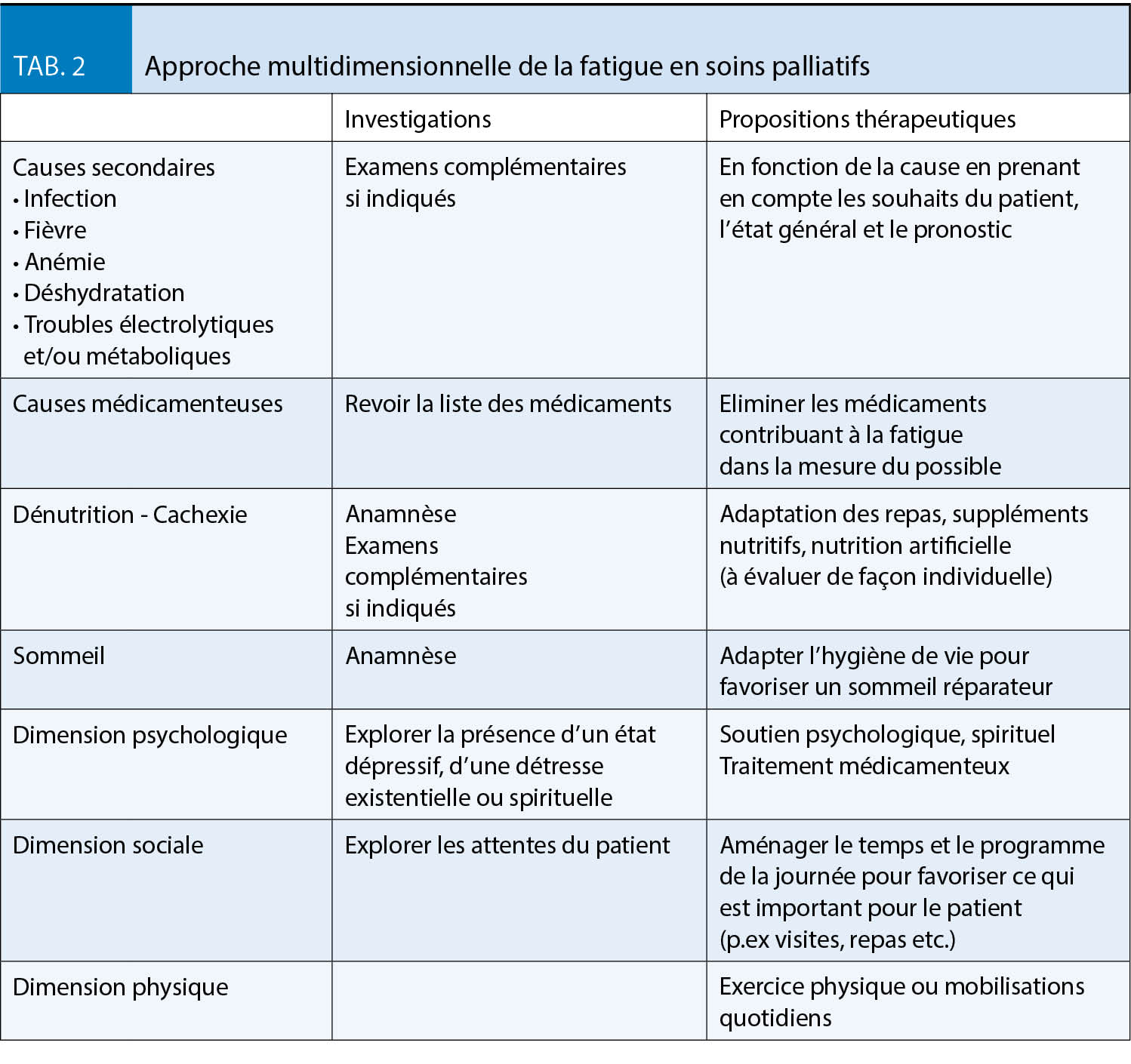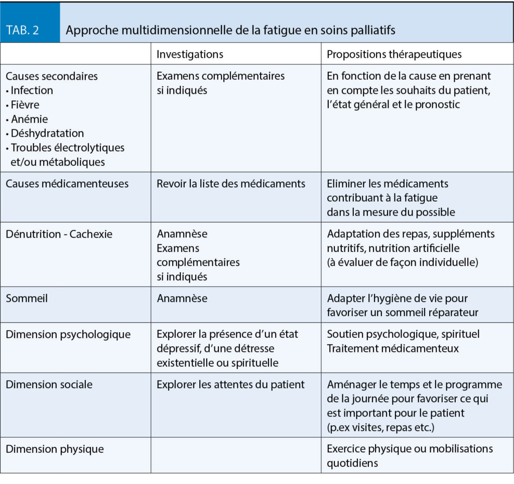 La fatigue peut être perçue comme un symptôme habituel auquel on ne porte que très peu d’ attention. Pourtant, elle peut avoir un impact majeur sur la qualité de vie. Sa prévalence se situe en moyenne aux alentours de 60 %, toutes maladies confondues, avec nettement plus de patients sous traitement de chimio- ou radiothérapie (17). Pour dépister une fatigue, l’ European Association of Palliative Care propose la question simple « Vous sentez-vous inhabituellement fatigué ou faible ? » avant de quantifier la fatigue avec l’ ESAS (17). Certaines causes secondaires telles que les infections, les troubles métaboliques et endocriniens, l’ anémie, pour n’ en nommer que quelques-uns, sont à explorer et à traiter dans la mesure du possible et du raisonnable. Une approche multidimensionnelle s’ impose (Tab. 2). Les traitements médicamenteux sont plutôt décevants et c’ est surtout l’ exercice physique qui a démontré une certaine efficacité (18). Toutefois, un essai par corticostéroides (p.ex déxaméthasone 4-8 mg par jour) pendant 5 jours peut être effectué. S’ il est concluant, on peut continuer le traitement pendant un maximum de deux semaines; au-delà l’ effet s’ estompe. D’ autres études chez des patients jeunes atteints de cancer montrent de bons résultats sous méthylphenidate. Cependant son profil d’ effets secondaires invite à la prudence chez les patients âgés.