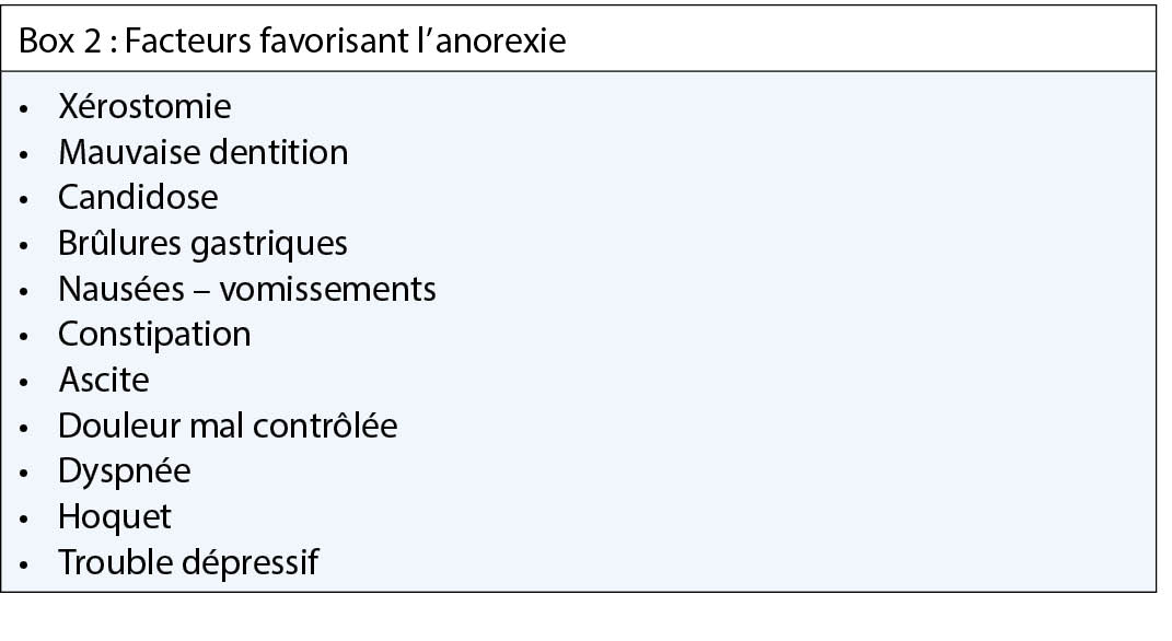 L’ anorexie est définie comme un manque d’ appétit ou une réduction des apports nutritifs. Elle est très fréquente dans la phase terminale des maladies oncologiques (85 % (19)), mais aussi dans les insuffisances cardiaques, rénales ou pulmonaires (50 % (20)). Souvent, l’ anorexie est une des préoccupations principales de l’ entourage et une source d’ inquiétude. Sa prise en charge se fait donc de façon individuelle après une évaluation approfondie qui comprend non seulement l’ anamnèse des habitudes alimentaires, la présence de facteurs favorisant l’ anorexie (Box 2), mais aussi la représentation de l’ alimentation et les attentes du patient et de son entourage. Les facteurs favorisant l’ anorexie sont à traiter dans la mesure du possible. A un stade précoce de la maladie, une nutrition artificielle peut être envisagée. Au stade avancé (espérance de vie < 3 mois) une alimentation plaisir est à privilégier. Souvent une adaptation des portions, leur fréquence, la texture, mais aussi du contenu s’ avèrent nécessaire. L’ aide d’ une diététicienne peut être bénéfique. Des suppléments nutritifs oraux sont parfois indiqués. Comme médication qui stimule l’ appétit, on peut proposer une cure par corticostéroïdes (prednisone 0.5mg/kg/j ou dexaméthasone 0.1 mg / kg/j) dont l’ efficacité est déjà perceptible après 5 jours, mais qui s’ estompe au-delà de 2 semaines (21).