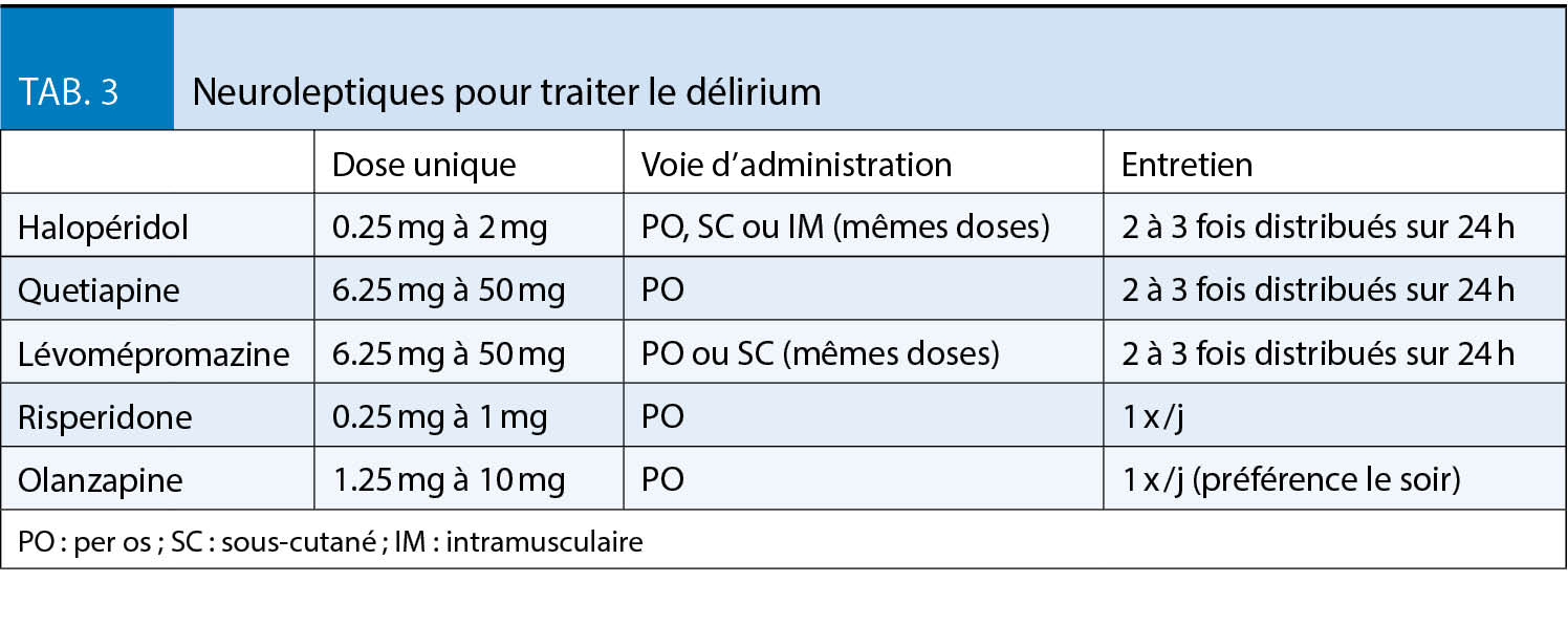 L’ état confusionnel est présent chez 13-88 % des patients avec une incidence qui augmente vers la toute fin de vie (22). Chez 30-50 %, l’ état confusionnel est précipité par des causes réversibles (infection, fécalome/constipation, rétention urinaire, troubles électrolytiques, médicaments). En fonction de l’ état de santé du patient et le pronostic, on peut envisager de chercher et traiter ces causes tout en proposant un traitement symptomatique en parallèle. Cependant, une étude récente a démontré, en comparant l’ halopéridol et la risperidone à des mesures non-pharmacologiques, que ces dernières étaient plus efficaces pour soulager les patients que les neuroleptiques (23). Une approche non pharmacologique est donc à privilégier. Bien entendu que si la souffrance, notamment en cas d’ état confusionnel hyperactif, est importante, l’ administration de neuroleptique est indispensable. Les molécules et dosages se trouvent dans le tableau 3.