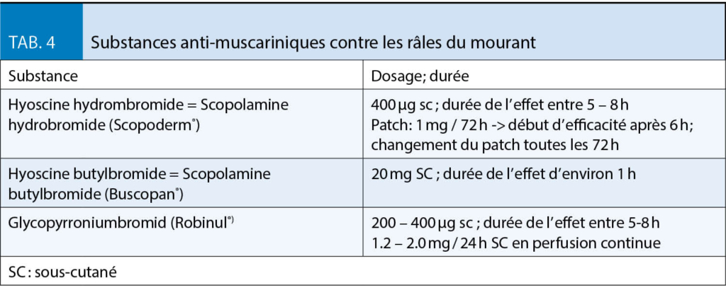 L’ encombrement bronchique haut qui porte aussi le nom « râles du mourant » se manifeste les derniers jours de vie, voire les heures précédant le décès. Jusqu’ à 92 % des personnes le présentent. Lors de troubles de la conscience, le réflexe de la déglutition est diminué, laissant les sécrétions s’ accumuler dans la trachée et les bronches. L’ air passant crée ainsi des vibrations oscillatoires perçues comme râles. Cet encombrement n’ est pas à confondre avec celui provoqué par une congestion alvéolaire due à une infection pulmonaire ou une décompensation cardiaque. Même si ce bruit peut être très gênant pour les proches, il n’ y a aucune évidence que ces râles engendrent une gêne quelconque au patient. Une prise en charge médicamenteuse ne s’ impose donc pas nécessairement (24). En premier lieu, il est important de chercher le contact et la communication avec les proches pour les rassurer. Toutefois, si une diminution de ces sécrétions est souhaitée, un essai de traitement médicamenteux anti-muscarinique peut être tenté, même si l’ effet de ces substances n’ a jamais été démontré contre un placebo (25). En Suisse, trois substances sont disponibles (tab. 4). Une autre option est l’ aspiration mécanique qui devrait être utilisée avec parcimonie, car à risque d’ être traumatique en cas d’ utilisation répétée.
