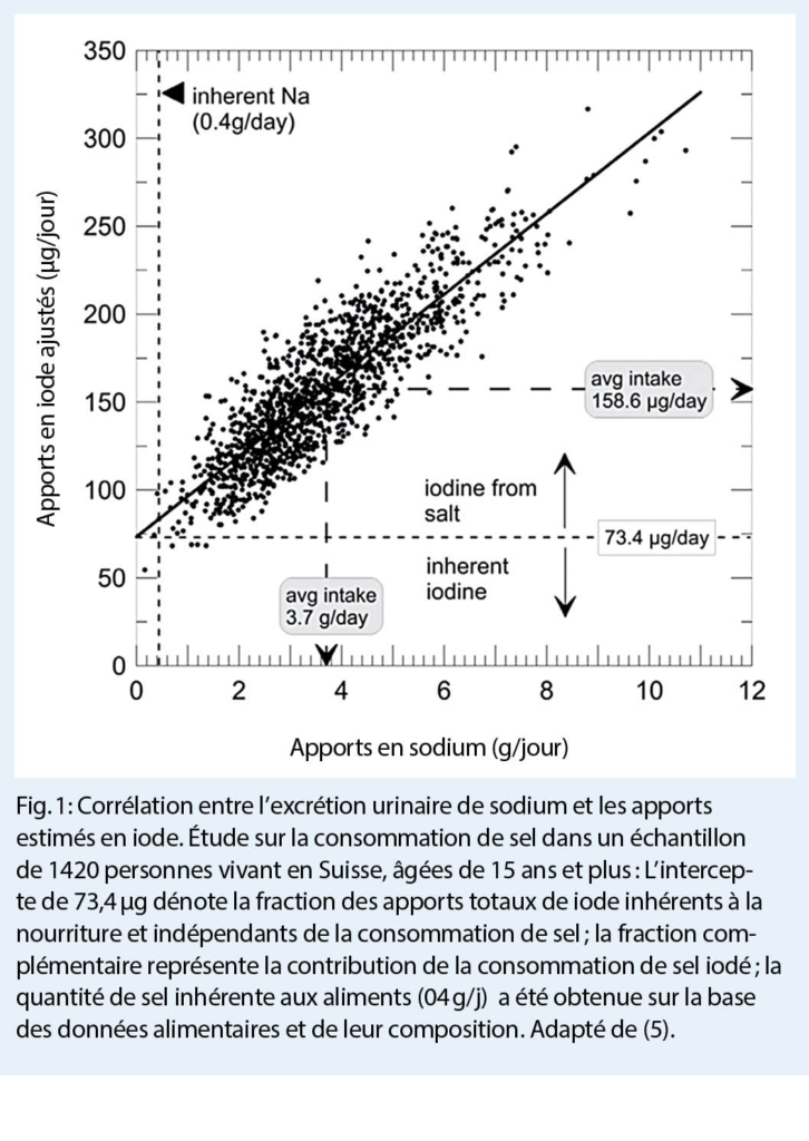Le iode est un élément essentiel pour tous les organismes vivants. Le déficit en iode est reconnu depuis le début du XXe siècle comme une cause majeure du goitre et du crétinisme (4). Aujourd’ hui, la carence en iode, même modérée, est surtout associée à des troubles du développement cérébral et des troubles cognitifs chez l’ enfant. En Suisse, la consommation de iode est intrinsèquement liée à celle du sel. En effet, depuis 1922, date à laquelle une Commission Fédérale pour la prophylaxie du goitre (4) à décidé de donner du iode à la population, le sel est enrichi en iode à des concentrations qui sont en augmentation constante : 3.75 mg/kg en 1922, 15 mg/kg en 1980 et 25 mg/kg en 2014. Pour obtenir les taux urinaires de iode recommandés par l’ OMS (100 μg/jour) il faut manger plus de 5 grammes de sel par jour. Dans l’ étude suisse sur la consommation de sel, réalisée entre 2010 et 2012, l’ excrétion urinaire de iode a été mesurée (5). Il s’ est avéré que 14 % des femmes et 2 % des hommes présentaient un déficit en iode (Fig. 1). Le déficit était plus marqué chez les femmes parce qu’ elles mangent globalement moins que les hommes et dès lors, elles ont un apport en sodium et iode inférieur. Ces données ont conduit à une augmentation du contenu en iode du sel en 2014. Cette observation pose donc la question de la pertinence d’ une réduction globale de la consommation de sel dans la population pour prévenir l’ hypertension artérielle, en particulier chez les jeunes femmes qui ont un risque d’ hypertension et de maladies cardiovasculaires plutôt bas, en tout cas jusqu’ à la ménopause.