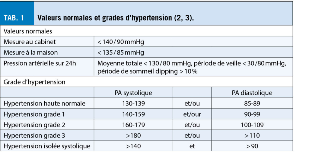 Dans de nombreux patients, cependant, il n’ est pas facile de poser le diagnostic car les valeurs de leur tension artérielle fluctuent beaucoup ou ne sont trop élevées que dans certaines situations de la vie. Les valeurs de la pression artérielle mesurées en présences des symptômes (maux de tête, anxiété, palpitations…) ne doivent pas être comparées aux valeurs normales au repos. Les valeurs normales de la pression artérielle sont résumées dans le tableau 1.