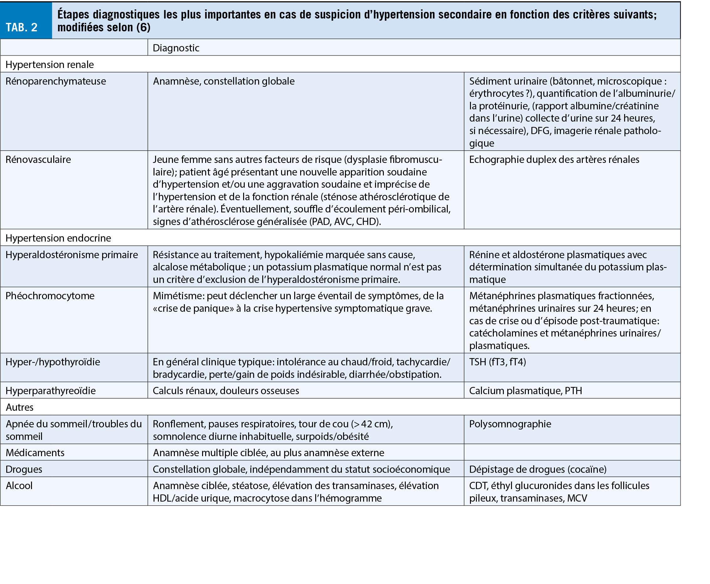 Les tests détaillés utilisés pour diagnostiquer les différentes formes d’ hypertension secondaire sont résumés dans le tableau 2.