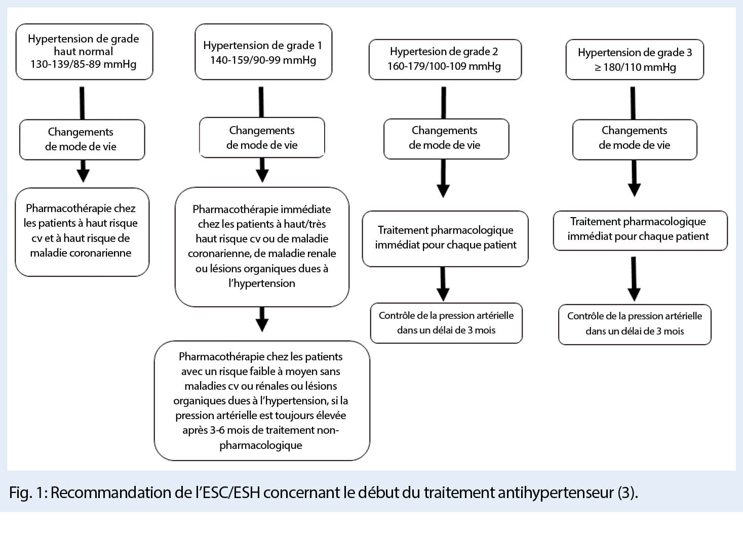 La décision d’ initier un traitement pharmacologique doit être individualisée. Les patients doivent être activement impliqués dans une telle décision. Selon les lignes directrices de l’ ESC/ESH (3), chez les patients atteints d’ une hypertension de grade 2 ou 3, un traitement pharmacologique antihypertenseur doit être initié rapidement en même temps que des modifications du mode de vie. Chez les personnes présentant une pression artérielle normale ou une hypertension de grade 1 et un risque cardiovasculaire très élevé, il convient d’ instaurer un traitement médicamenteux ou, après un certain temps, un traitement non pharmacologique (fig. 1).