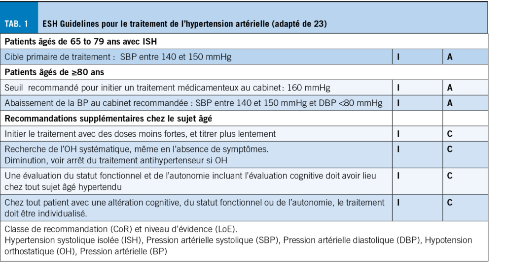 Une cible de TAs inférieure à 130/80mmHg, mais non inférieure à 120/70 mmHgest recommandée pour tous les adultes hypertendus si la tolérance est bonne. La recommandation est valable aussi pour les sujets âgés de 65 ans et plus, pour autant qu’ ils ne soient pas institutionnalisés et que le traitement instauré soit bien toléré. Pour les âgés souffrant de lourdes comorbidités et avec une espérance de vie limitée (catégorie dépendant), le choix et l’ intensité du traitement antihypertenseur doit tenir compte du jugement clinique, de l’ évaluation du risque – bénéfice et des préférences du patient.