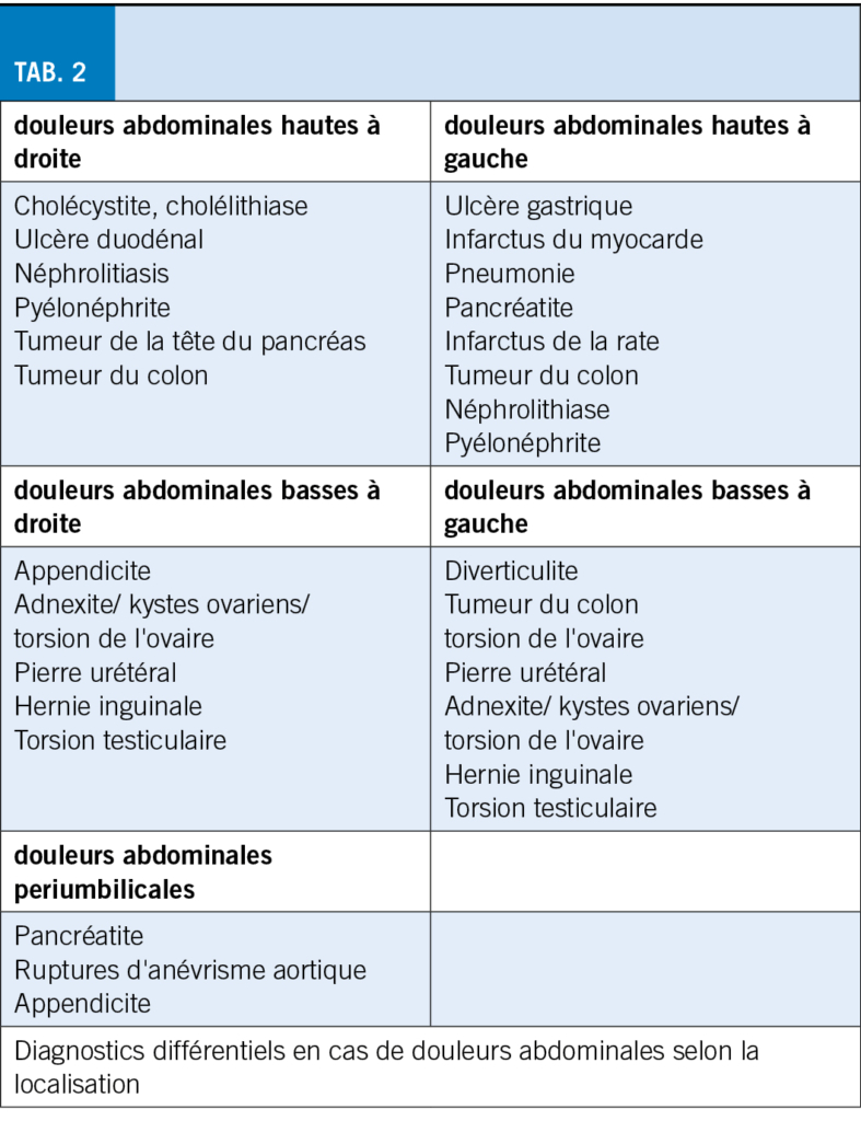 Les douleurs abdominales sont fréquentes dans la pratique quotidienne. On peut distinguer les douleurs abdominales aiguës et chroniques ainsi que les troubles organiques ou fonctionnels. En outre, la localisation des douleurs est déterminante et il convient de prendre en compte les maladies systémiques ou extra-abdominales qui se manifestent dans la cavité abdominale. Il est particulièrement important de savoir si les douleurs abdominales s’accompagnent d’une menace aiguë pour la personne concernée. Dans ce cas, une action rapide est très importante pour le pronostic ultérieur. En cas de douleurs abdominales chroniques, il est parfois possible et nécessaire d’établir un diagnostic détaillé afin d’exclure également des pathologies plus rares.