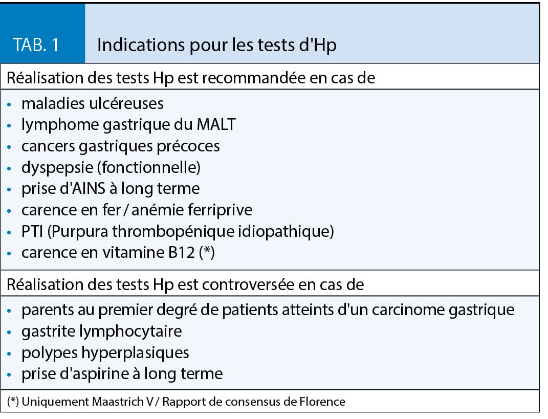 Une distinction fondamentale doit être faite entre les méthodes invasives (prélèvement de biopsie avec histologie, immunohistologie et PCR) et les méthodes non invasives (antigène des selles, test respiratoire C13, sérologie et test respiratoire). Les sérologies sont rarement pertinentes, parce qu’elles ne permettent pas de faire la distinction entre infection active et éradication réussie. Dans la pratique, le test de l’’antigène des selles est recommandé. En effet, il est simple et très précis. Alternativement, un test d’haleine ayant des caractéristiques et des coûts comparables peut être utilisé. Il est important que les essais soient effectués dans des conditions optimales. En effet, pour éviter des résultats faussement négatifs, les inhibiteurs de la pompe à protons (IPP) devraient être interrompus 2 semaines avant le test et les traitements antibiotiques 4 semaines avant (10). La question de savoir si une endoscopie avec prélèvement de biopsie est indiquée fait l’objet d’une discussion controversée, en particulier concernant les patients souffrant de troubles dyspeptiques non spécifiques. L’endoscopie précoce (scope-and-treat) favorise une amélioration plus importante des symptômes, ainsi que la satisfaction des patients. Cependant, les coûts de l’endoscopie précoce sont bien plus élevés par rapport aux tests d’Hp non invasifs (test-and-treat) (11). Pourtant, l’endoscopie est fortement indiquée pour les patients âgés de plus de 50 ans ou s’il y a des symptômes d’alarme tels que la perte de poids, l’anémie, la dysphagie ou les saignements gastro-intestinaux (8, 9).