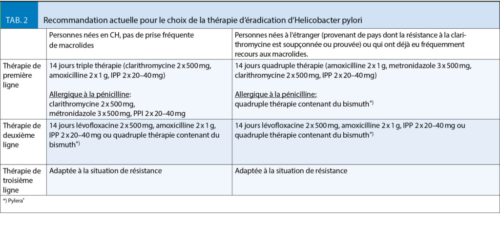 Il existe d’innombrables programmes d’éradication de l’Hp différant considérablement en termes de combinaisons de médicaments et de durée. La triple thérapie italienne (métronidazole, clarithromycine et IPP) et française (amoxicilline, clarithromycine et IPP) sont bien établies en Suisse, en particulier pour l’expérience d’éradication primaire. En outre, il existe des combinaisons de quatre médicaments pouvant être utilisées comme thérapie concomitante (amoxicilline, métronidazole, clarithromycine et IPP), séquentielle (amoxicilline et IPP, puis métronidazole, clarithromycine et IPP) ou quadruple thérapie hybride (amoxicilline et IPP, puis amoxicilline, métronidazole, clarithromycine et IPP). Dans les pays anglophones, la quadruple thérapie contenant du bismuth (métronidazole, tétracycline, bismuth et PPI) est fréquemment utilisée. Pylera®, la préparation combinée contenant du bismuth, est autorisée en Suisse. L’enregistrement dans la liste des spécialités est prévue pour 2018. Elle est cependant déjà disponible sur ordonnance en Allemagne. Les taux d’éradication atteints avec Pylera® sont extrêmement élevés (> 90%) (12, 13). Toutefois, l’inconvénient est qu’il faut prendre 3 x 4 comprimés de Pylera® par jour et 2 x 1 comprimé d’un IPP (un total de 14 comprimés / jour) afin d’obtenir une dose suffisante.