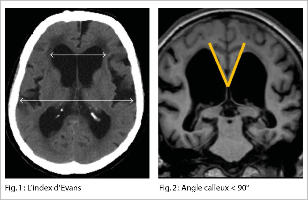 Le CT cérébral tout comme l’ IRM cérébrale montrent chez les patients atteints d’ HPNi la dilatation ventriculaire. Toutefois, la résolution et la performance de l’ IRM cérébrale en font l’ examen de choix pour l’ évaluation radiologique de l’ HPNi. Outre la caractérisation de l’ hydrocéphalie, l’ IRM permet également de rendre évidentes d’ autres pathologies du système nerveux central pouvant avoir une répercussion sur la prise en charge, soit dans le cadre du diagnostic différentiel, soit comme facteur pronostique. La démarche diagnostique consiste donc d’ abord à confirmer l’ existence d’ une dilatation ventriculaire pathologique. Pour ce faire, il est possible d’ utiliser la « iNPH Radscale », une échelle regroupant les signes radiologiques de l’ HPNi et qui a une bonne corrélation avec les signes cliniques. Elle ne prédit toutefois pas la réponse à un éventuel shunt (4). Font notamment partie de cette échelle l’ index d’ Evans et l’ angle calleux (décrit plus précisément ci-dessous); l’ amincissement des espaces au niveau du sillon parafalcoriel et du vertex ; la dilatation disproportionnée des vallées sylviennes ; l’ élargissement localisé d’ un sillon ; l’ agrandissement des cornes temporales et la présence d’ hypodensités périventriculaires. A noter qu’ en cas de dilatation du système ventriculaire supratentoriel (1er à 3e ventricules) avec un 4e ventricule normalement configuré, cela est suggestif d’ une hydrocéphalie obstructive sur sténose de l’ aqueduc et implique une autre approche diagnostique qui n’ est pas traitée ici.