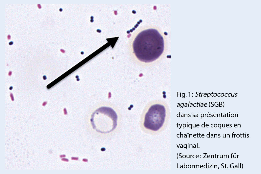 Les SGB font partie de la flore intestinale normale (11). Le taux de colonisation vaginale des femmes enceintes en Allemagne est d’ environ 16 % (12). Des infections graves sous forme de septicémie, de méningite et/ou de pneumonie surviennent chez 1 à 2 % des nouveau-nés matures et surtout prématurés colonisés par des SGB (13, 15) (tab. 1). La ligne directrice S2k AWMF recommande le dépistage des SGB chez les femmes enceintes au moyen d’ un frottis rectal et vaginal combiné entre 35 + 0/7 et 37 + 0/7 semaines de grossesse (13). Les frottis vaginaux profonds et les frottis cervicaux sont déconseillés (13, 14). Pour le diagnostic de laboratoire, les directives recommandent l’ utilisation de bouillons d’ enrichissement de SGB avec mise en culture ultérieure (15, 16, 18).