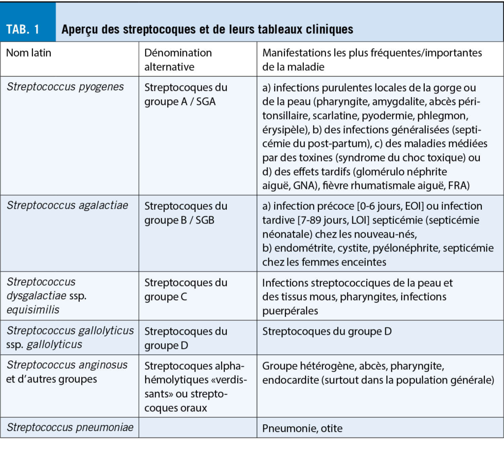 Nous constatons une grande variabilité des infections associées aux streptocoques non seulement sur le plan microbiologique, mais aussi en ce qui concerne les tableaux cliniques qu’ elles provoquent (tab. 1), c’ est pourquoi les directives actuelles doivent être considérées avec une certaine réserve. Les recommandations internationales concernant l’ amygdalopharyngite aiguë (APA), le dépistage des SGB pour la prévention de la septicémie/méningite précoce du nouveau-né et les lignes directrices sur l’ endocardite avec une attention particulière sur les streptocoques oraux en tant qu’ agents pathogènes sont discutées et résumées ci-dessous.