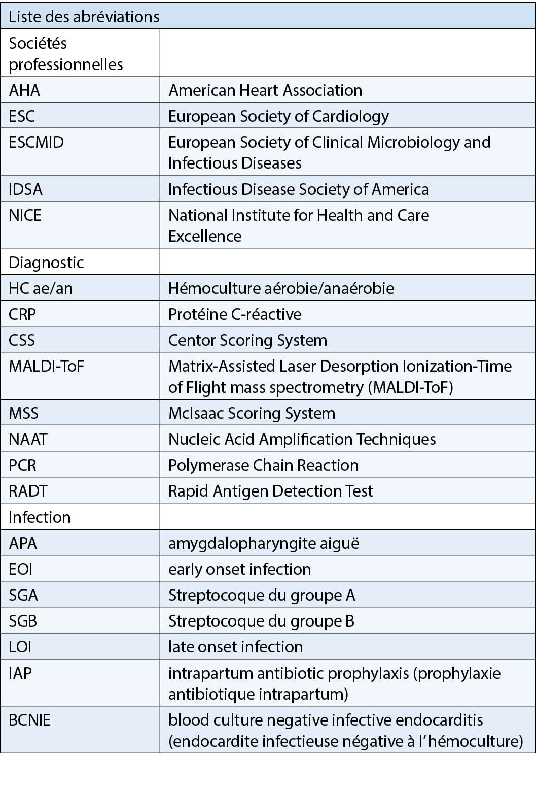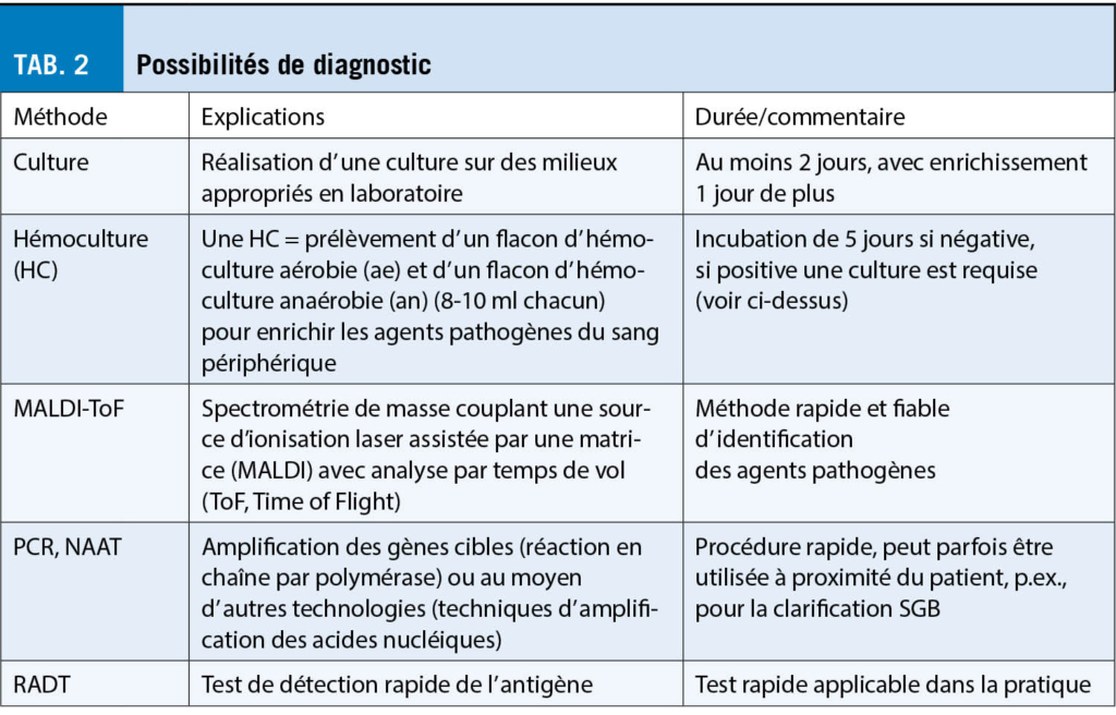 Dans les directives, le système d’ évaluation clinique selon Centor (CSS) ou McIsaac (MSS), les tests de détection rapide de l’ antigène (RADT) et la culture d’ enrichissement classique sont discutés pour le diagnostic du GAS-ATP (tab. 2). La détection par NAAT/PCR ne semble pas adéquate compte tenu des coûts comparativement élevés (7). Les méthodes de détection sérologique – à l’ exception de l’ exclusion de la nécrose aiguë de la rétine (ARN) et des fimbriae agrégatives (AGF) – n’ ont pas de rôle en clinique.