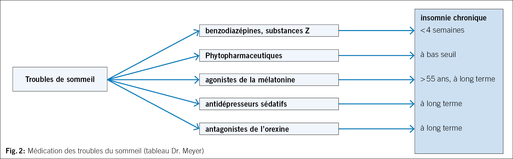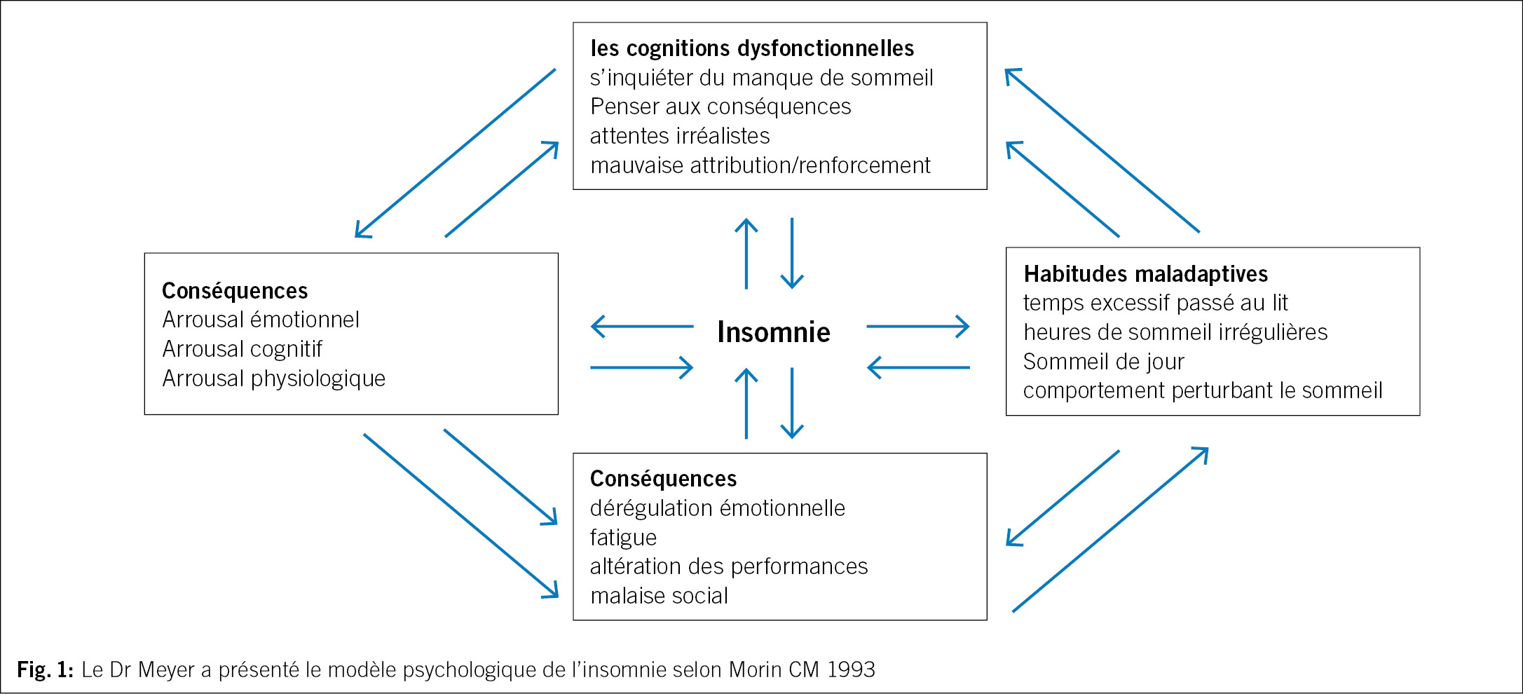 L’ insomnie survient au moins trois nuits par semaine et dure au moins trois mois. Elle survient malgré des occasions de dormir suffisantes. Elle n’ est pas mieux expliquée et ne survient pas exclusivement dans le cadre d’ un autre trouble du sommeil, de l’ éveil ou du rythme. L’ insomnie ne peut pas être attribuée aux effets physiologiques d’ une substance (drogue ou médicament) et les maladies psychiques et physiques coexistantes n’ expliquent pas la survenue de l’ insomnie. (Fig. 1)